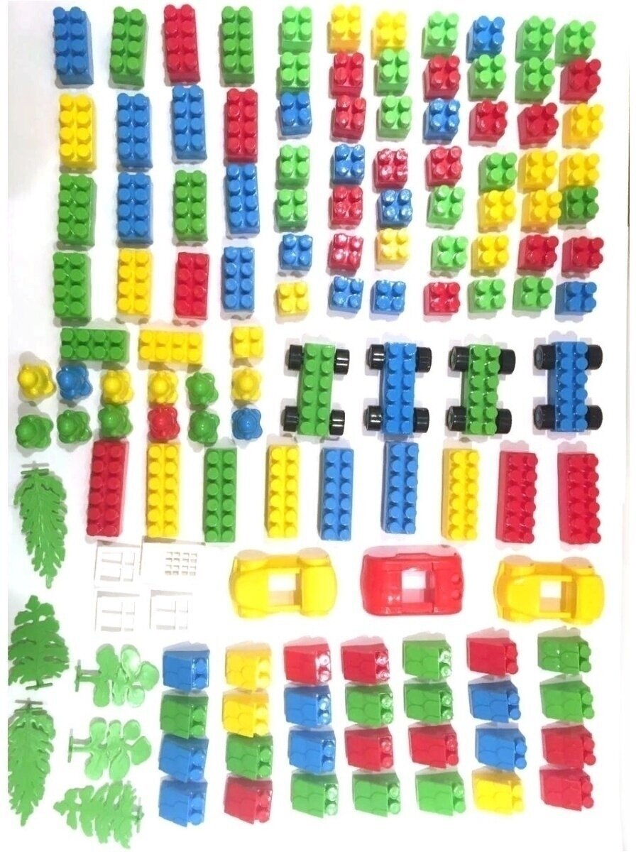 Состоит из разноцветных деталей разной длины. В набор входят следующие дополнительные элементы: платформы с колесами; оконные и дверные рамы и крыши для строительства домов; съемные корпусы машин; фигурки деревьев; модули забора с основаниями.
