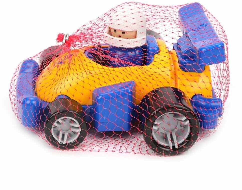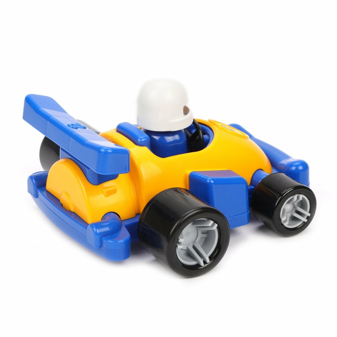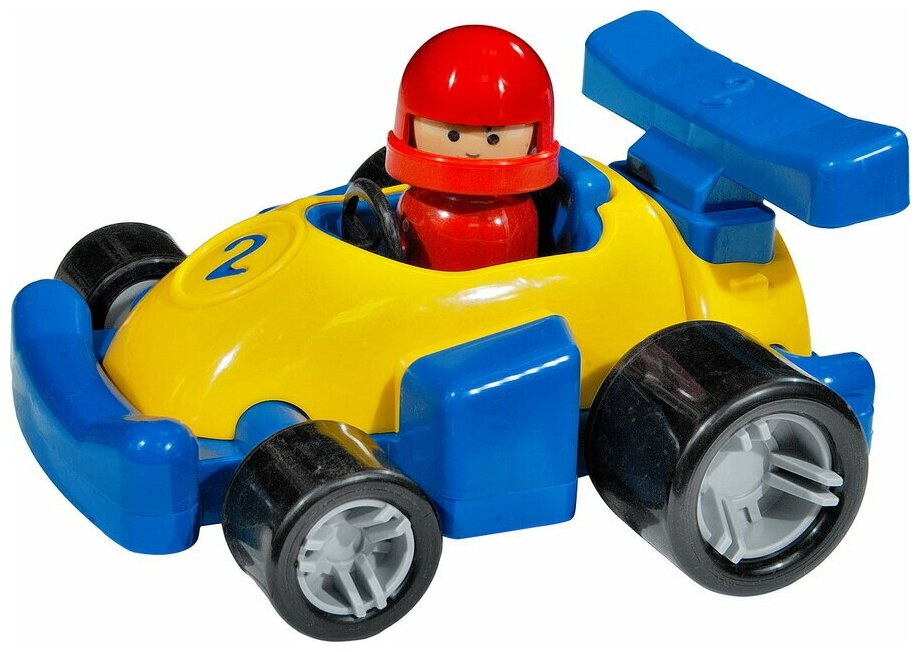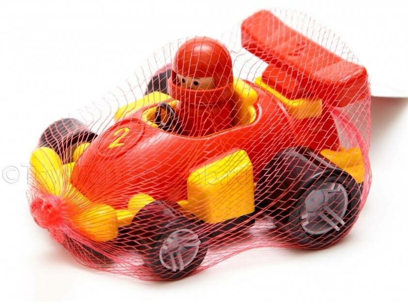 Машинка выполнена в стиле спортивного болида формулы-1 образца 80-х годов. Болид имеет футуристический облик и резиновые колеса. В капсуле управления установлен пилот. На данной машинке установлены резиновые колеса, эта особенность позволяет передвигать машину по полу бесшумно. Такие колеса также нужны в качестве инерционного механизма. Игрушка изготовлена из яркого пластика с различными цветовыми вставками, дополняющими и без того реалистичный облик.