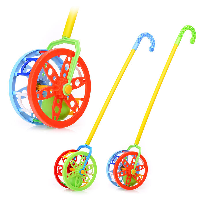 Играя с каталкой «Колесо», малыш будет наблюдать за вращением колеса и за шариком внутри. А во время движения игрушки слышится треск. Игрушки-каталки способствуют физическому развитию малыша - помогают сделать первые шаги и освоить навыки ходьбы.