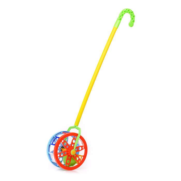 Игрушка-каталка в форме ажурного колесика оборудована трещоткой, которая издает звук при качении, а внутри барабана находится маленький звенящий шарик. Имеет удобную ручку оптимального размера для детской ладошки, разбирается на три части. Игрушка изготовлена из пластика, легко моется и предназначена для детей младшего возраста. Внимание! Цвет элементов игрушки может варьироваться.