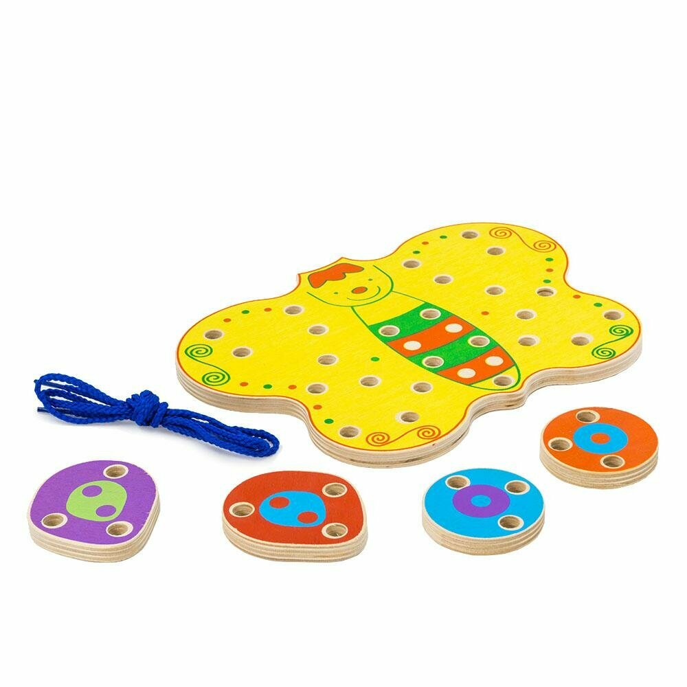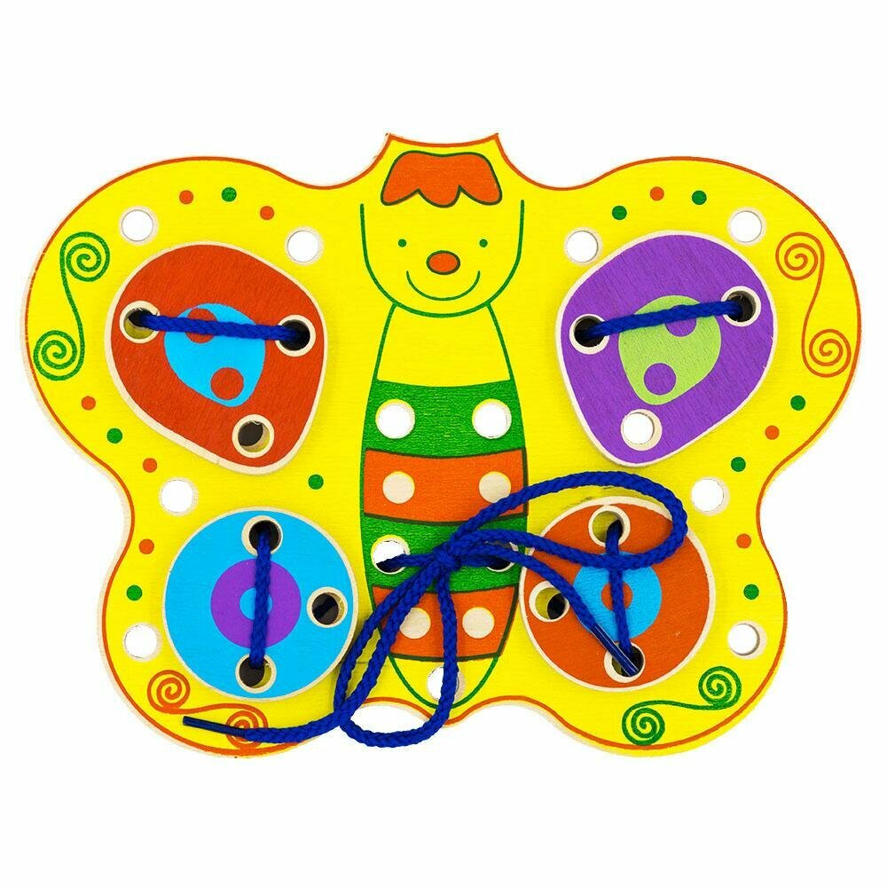 Шнуровка - полезная детская игра. Цель игры - разместить различные по цвету и размеру фигуры на крыльях бабочки с помощью цветного шнурка, продевая его в отверстия. Этот процесс доставит большое удовольствие малышу. Игра полезна тем, что тренирует координацию движений рук, мелкую моторику, развивает навыки захвата и ловкость.