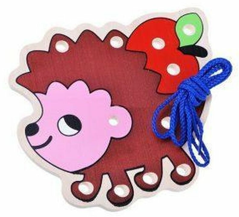 Шнуровка - полезная детская игра. Цель игры - прошнуровать ножки, яблочко и другие части ежика с помощью цветного шнурка, продевая его в отверстия. Этот процесс доставит большое удовольствие малышу. Игра полезна тем, что тренирует координацию движений рук, мелкую моторику, развивает навыки захвата и ловкость. Игры с шнуровками имеют хороший образовательный ресурс.