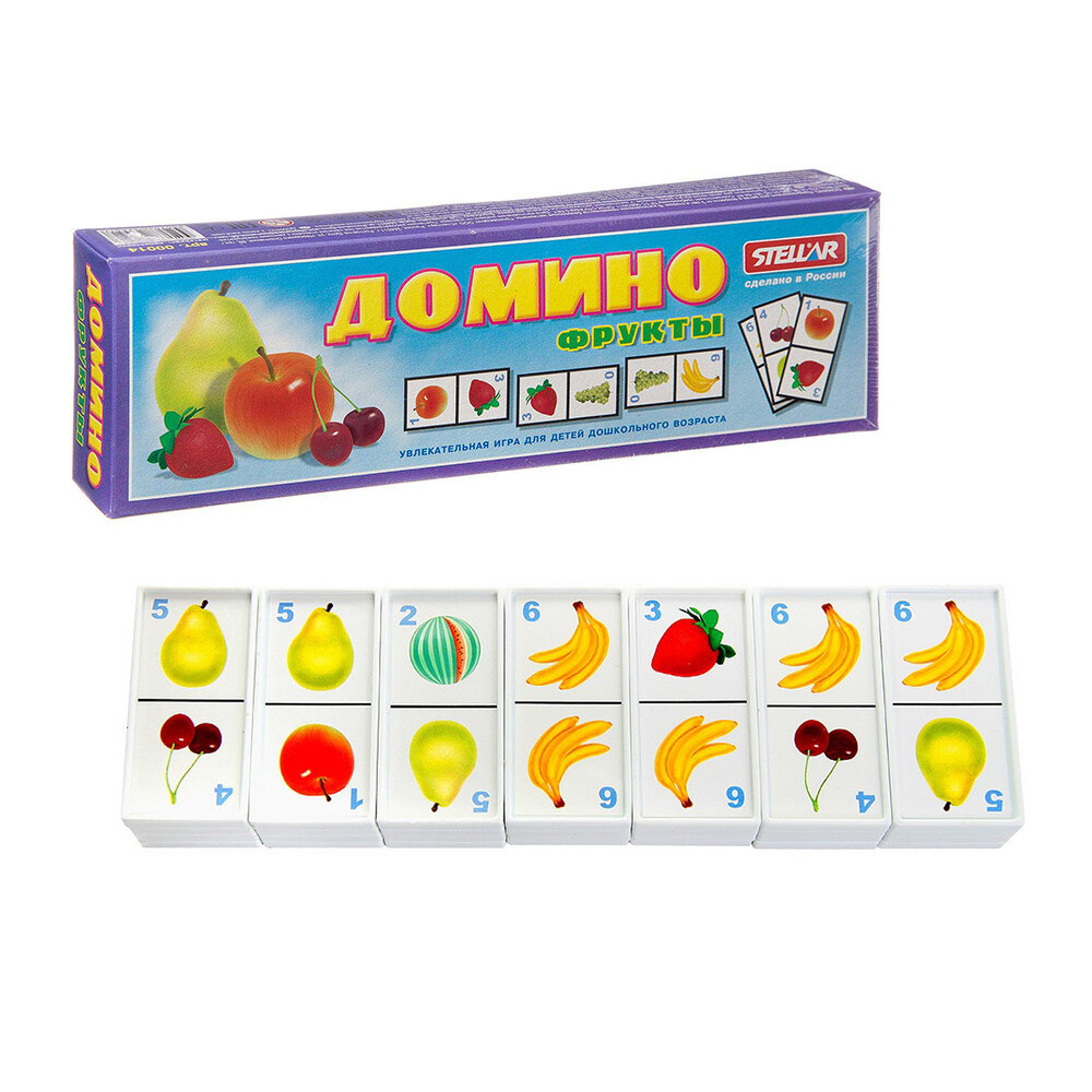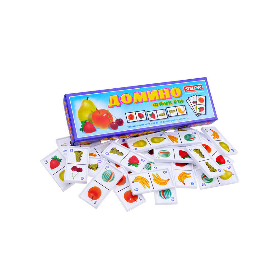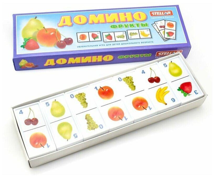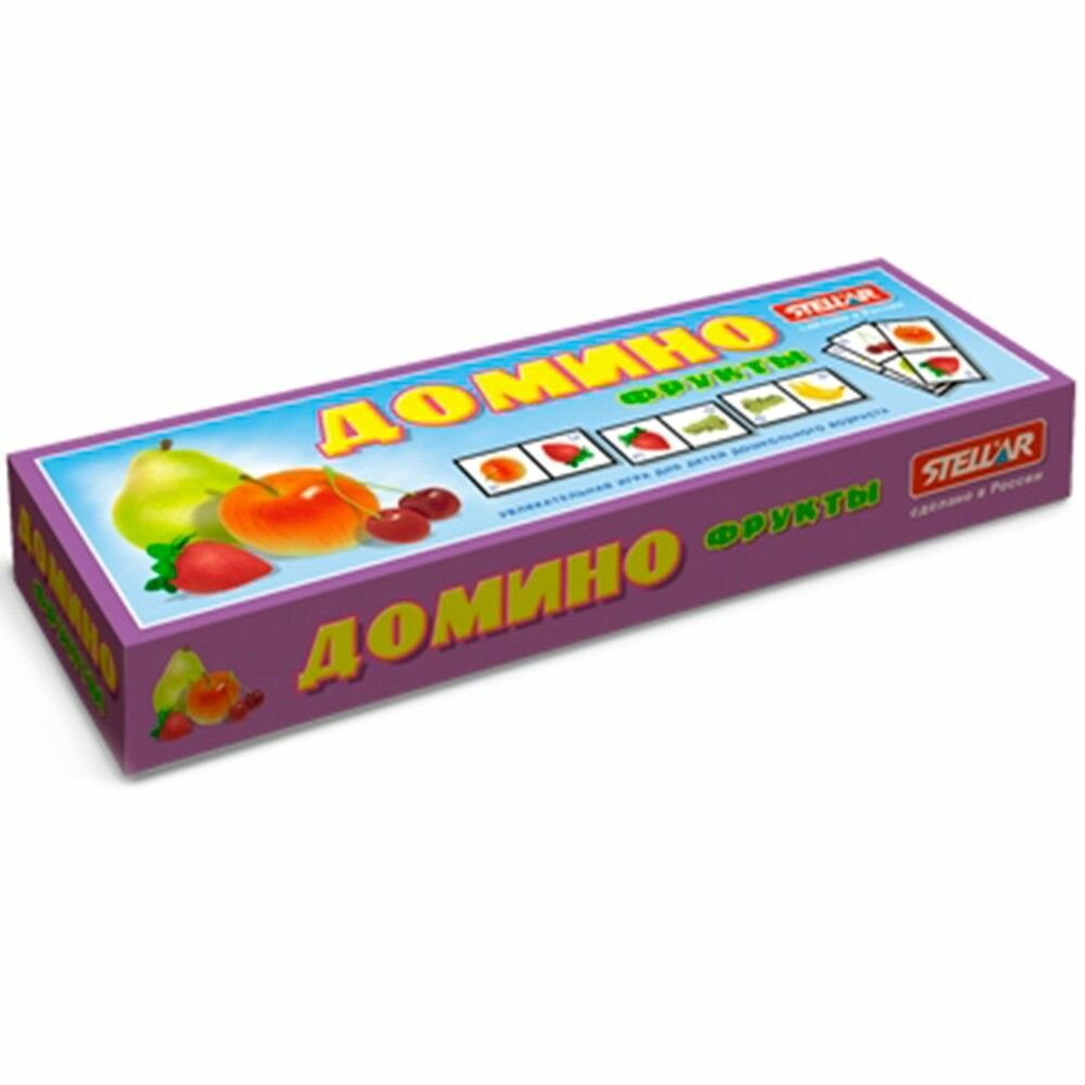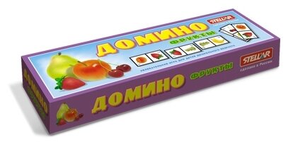 Домино Stellar Фрукты позволит вам и вашему малышу весело и с пользой провести время. Комплект игры включает в себя 28 фишек с красочными изображениями фруктов. Фишки выполнены из безопасного полистирола. Каждый игрок должен добавить в цепочку из фишек одну их своих фишек так, чтобы изображение на ней подошло к изображению на конце цепи. Если в руках у игрока нет подходящей фишки, он берет дополнительные до тех пор, пока не попадется нужная. Выигрывает тот, кто первым выложит все свои фишки. Также красочные фишки можно использовать в качестве обучающего материала - на примере картинок вы сможете рассказать малышу о фруктах. Игра в домино не только подарит малышу множество веселых мгновений, но и поможет познакомиться с новыми словами, а также развить внимательность, пространственное мышление и мелкую моторику.