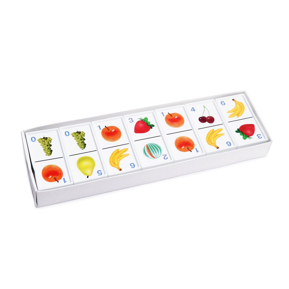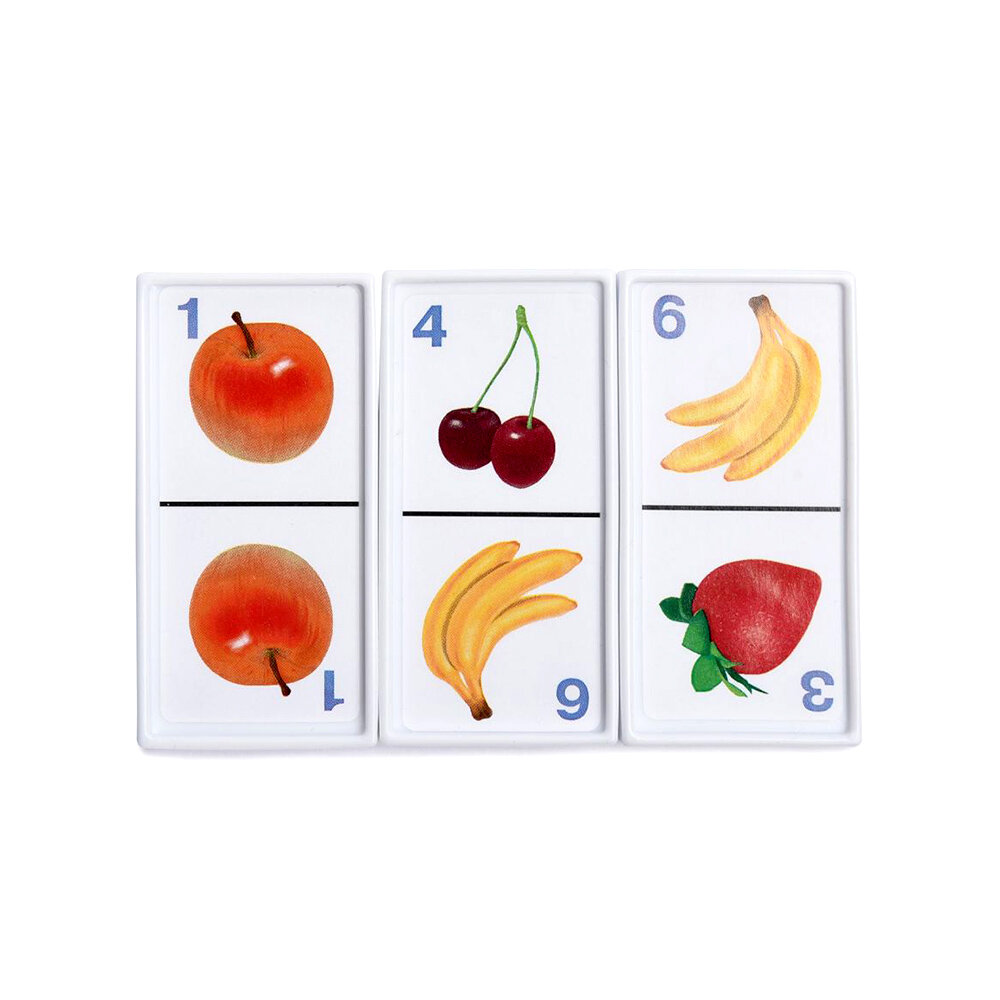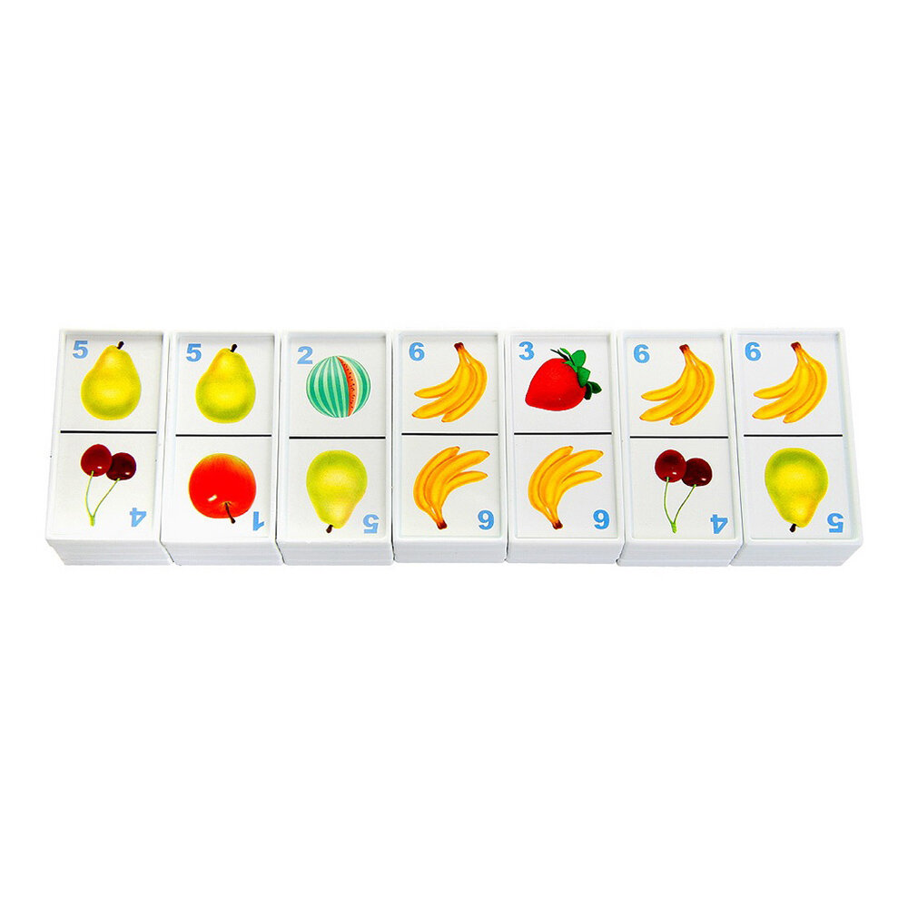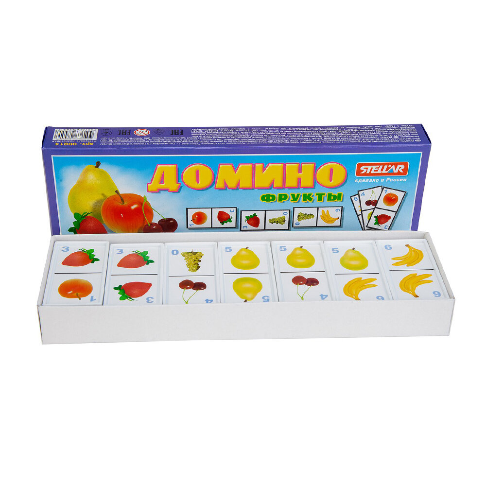 Домино Stellar Фрукты позволит вам и вашему малышу весело и с пользой провести время. Комплект игры включает в себя 28 фишек с красочными изображениями фруктов. Фишки выполнены из безопасного полистирола. Каждый игрок должен добавить в цепочку из фишек одну их своих фишек так, чтобы изображение на ней подошло к изображению на конце цепи. Если в руках у игрока нет подходящей фишки, он берет дополнительные до тех пор, пока не попадется нужная. Выигрывает тот, кто первым выложит все свои фишки. Также красочные фишки можно использовать в качестве обучающего материала - на примере картинок вы сможете рассказать малышу о фруктах. Игра в домино не только подарит малышу множество веселых мгновений, но и поможет познакомиться с новыми словами, а также развить внимательность, пространственное мышление и мелкую моторику.