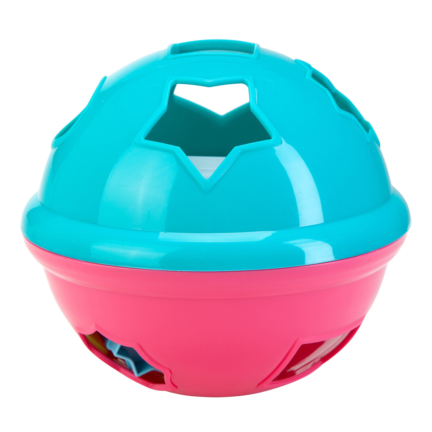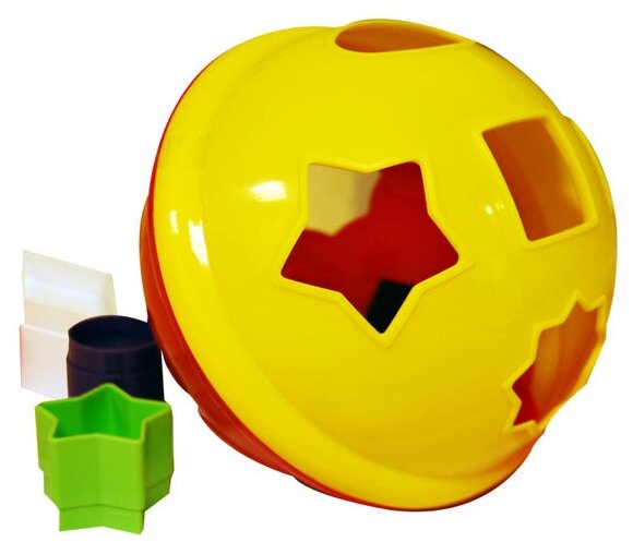 Логический шар – это забавный сортер, в отверстия которого малышу нужно протолкнуть фигурки. Сначала дети действуют силой и методом проб. Но уже совсем скоро у них получается зрительно соотносить фигурку и отверстие для нее. Малыши любят открывать и заковать шар, состоящий из двух частей, катать его по полу. А наполненный фигуркам сортер во время катания еще и гремит, забавляя ребёнка. Геометрическими фигурами можно делать отпечатки красками или на песке и манке.