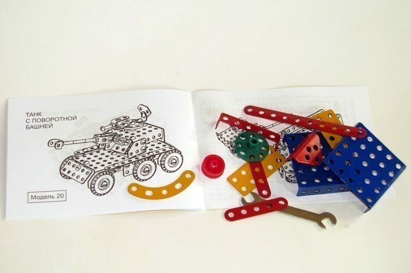 Металлический конструктор "Техник" станет хорошим подарком для всех мальчишек , любящих мастерить своими руками. Это классический конструктор с крепежными элементами, из которого можно сделать до двадцати разных моделей. Помимо деталей для сборки, в комплект входят крепежи, гаечный ключ, отвертка и инструкция. Из инструкции мальчик узнает, какие модели можно построить из конструктора - его наверняка порадует, что в их число входят и военные машинки.