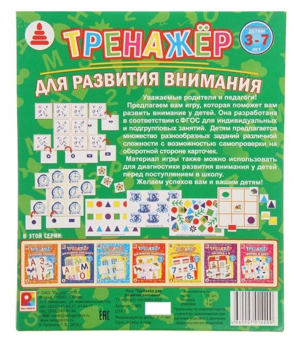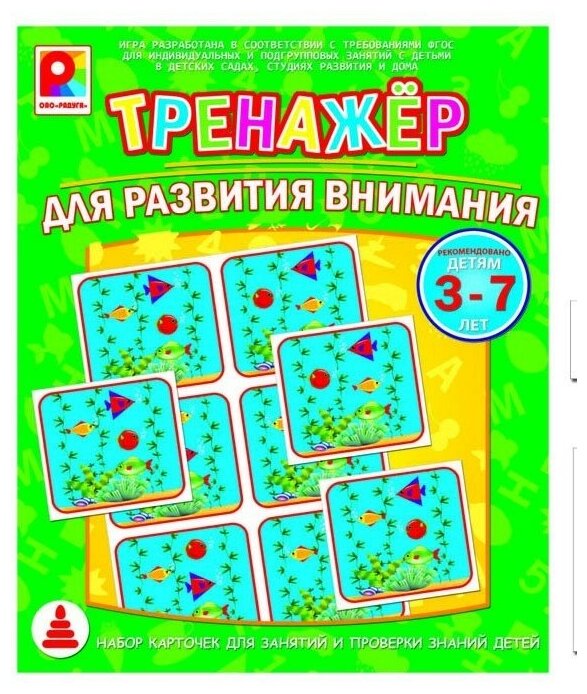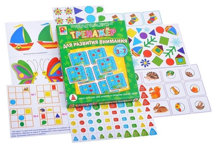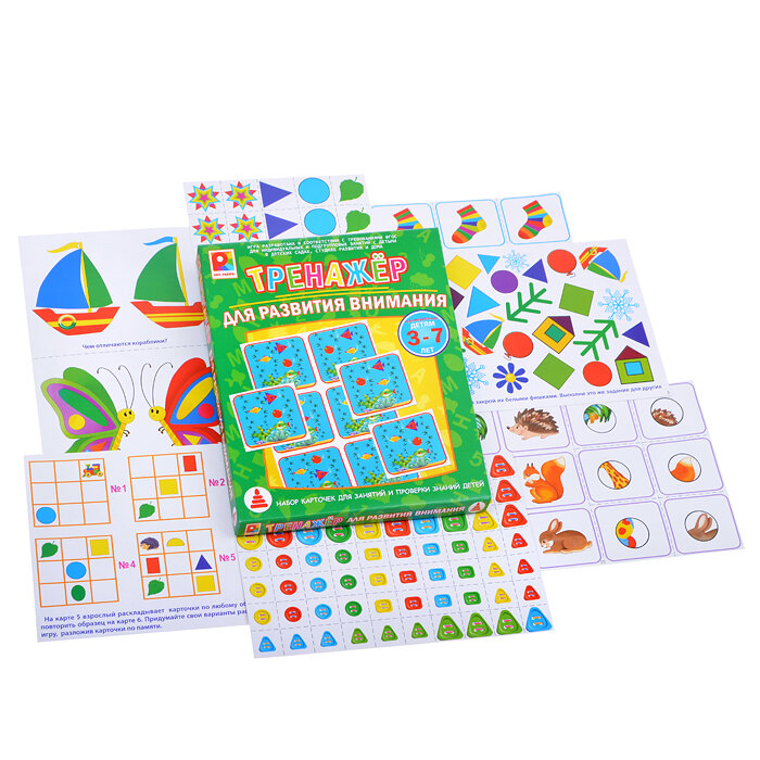 Игра Тренажер для развития внимания для детей 3-7 лет поможет развить внимание у детей. Она разработана в соответствии ФГОС для индивидуальных и подгрупповых занятий (2 - 5 детей). Детям предлагается множество разнообразных заданий различной сложности с возможностью самопроверки на оборотной стороне карточек. Материал игры также можно использовать для диагностики уровня развития внимания у детей перед поступлением в школу.