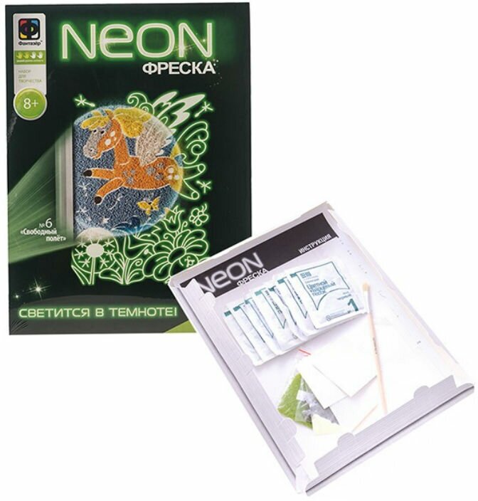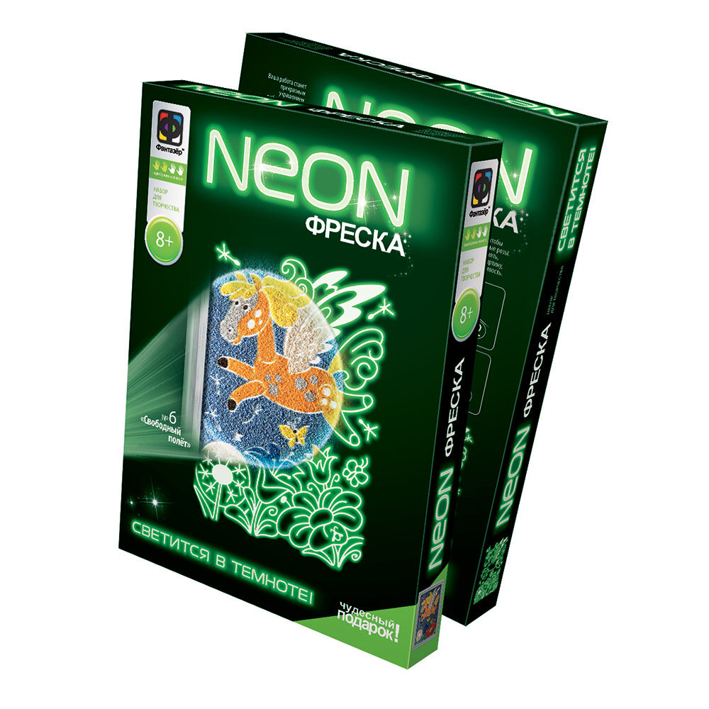 Неон фреска от российской компании "Фантазер" представляет собой трехслойную основу с трафаретом. На высеченный контурный рисунок с изображением нужно нанести разноцветный песок, воспользовавшись инструментами, которые также входят в комплект. Готовое изделие будет менять цвет в зависимости от освещения в комнате, излучая неоновый свет в темноте.