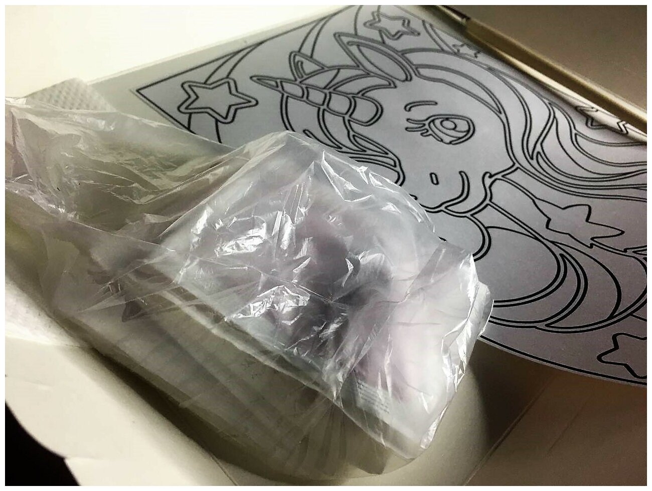 | Состав набора | трехслойная основа с высечным трафаретом, набор цветного песка, люминофор, заготовка рамки, деревянный стик, кисточка, бумажная салфетка, инструкция |