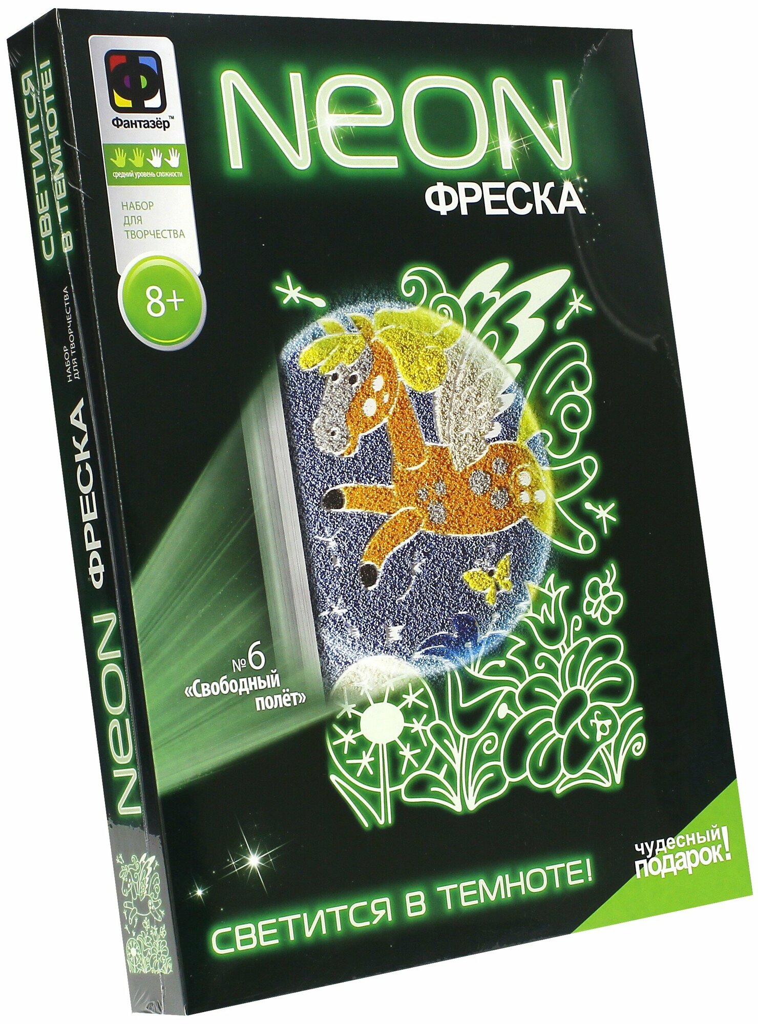Набор для творчества "Свободный полет" от компании "Фантазер" представляет собой фреску с нанесенным трафаретом. С помощью специального песка контурную картинку фантастического животного можно сделать более яркой. Выключив свет в комнате, можно увидеть неоновое свечение, которое создает невероятный световой эффект.