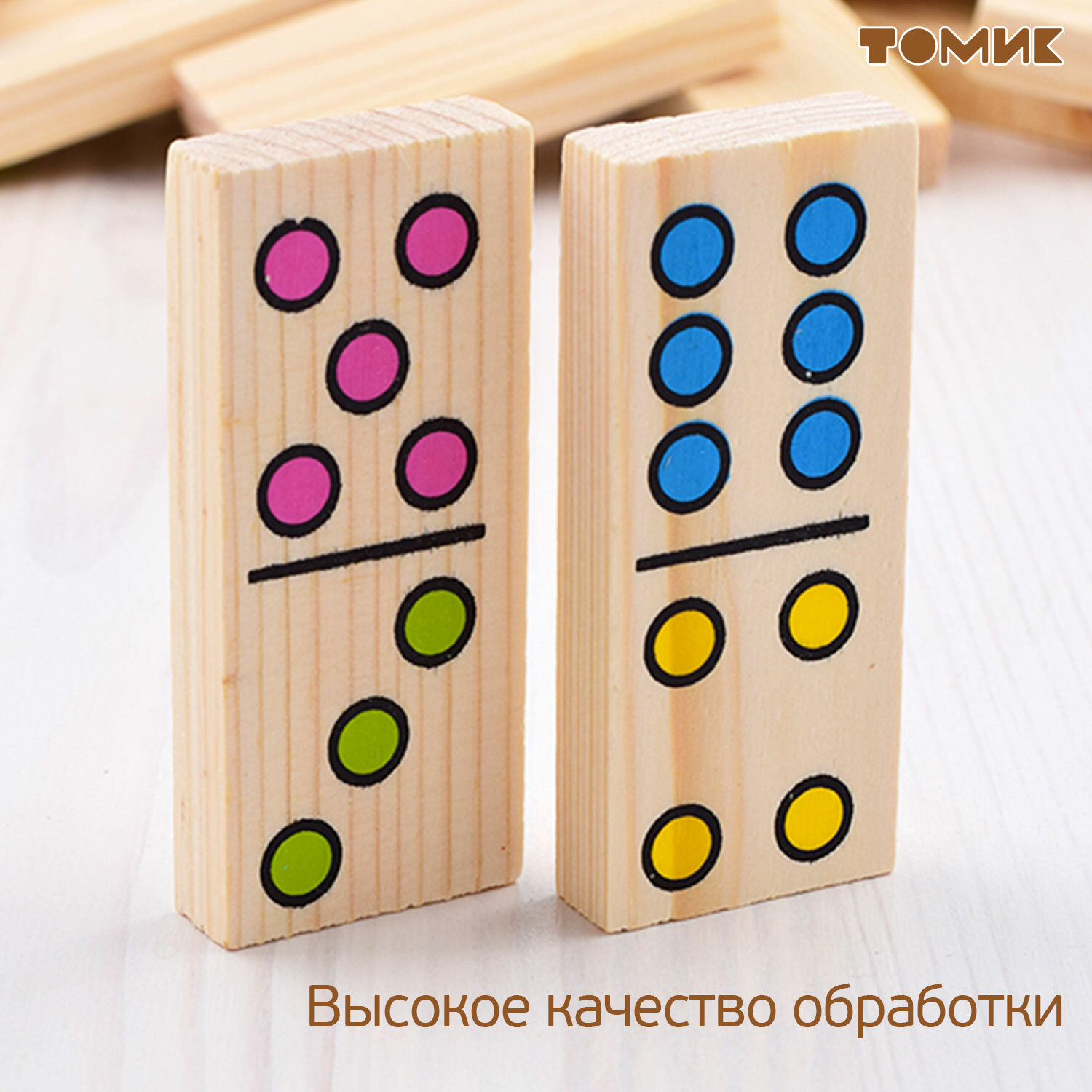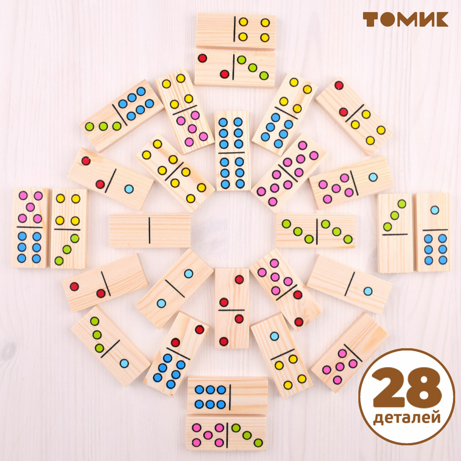 Набор Точки по сути представляет собой известную многим игру домино. Все элементы выполнены из качественного дерева, приятного на ощупь. На каждой дощечке изображено определенное количество ярких точек. Соединяя элементы домино, ребенок будет осваивать счет и учиться быстро различать цвета и оттенки. В эту игру увлекательно играть как с друзьями, так и в кругу семьи, это настоящая классика!