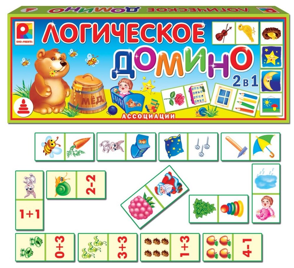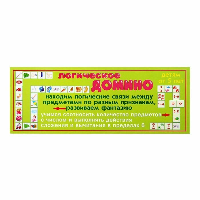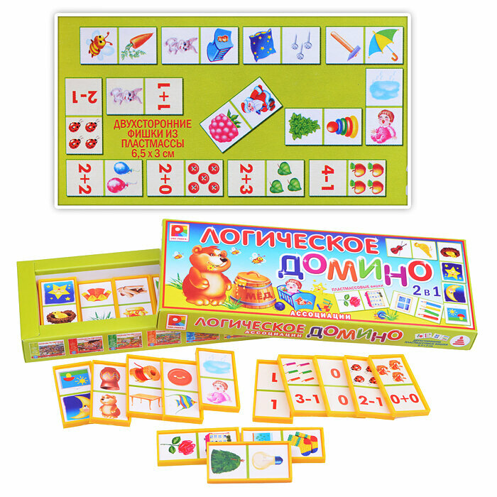 Игры в домино не только популярны, но и полезны. Фишки Логического домино. Ассоциации двусторонние. На одной стороне изображены разнообразные предметы. Необходимо найти два предмета, логически связанных между собой, например, зонтик и дождь, и соединить фишки домино. С помощью этого варианта игры дети развивают ассоциативное и логическое мышление, память. На другой стороне фишек домино - примеры по математике на сложение и вычитание, а также определённое количество предметов. Необходимо найти ответы на примеры и сложить фишки домино. Этот вариант учит считать в пределах шести. Яркие красочные рисунки на фишках домино понравятся детям.