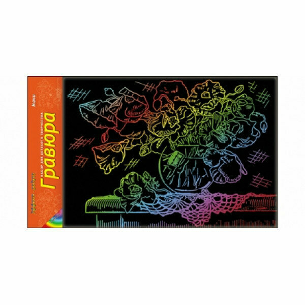Набор для творчества "Маки" от компании "Рыжий кот" включает в себя специальную основу с нанесенным контурным рисунком и металлический штихель. С ним ребенок сможет самостоятельно создать яркую гравюру формата А4 с эффектом радуги, на которой будет изображен пышный букет маков в круглой вазе, стоящей на столе.