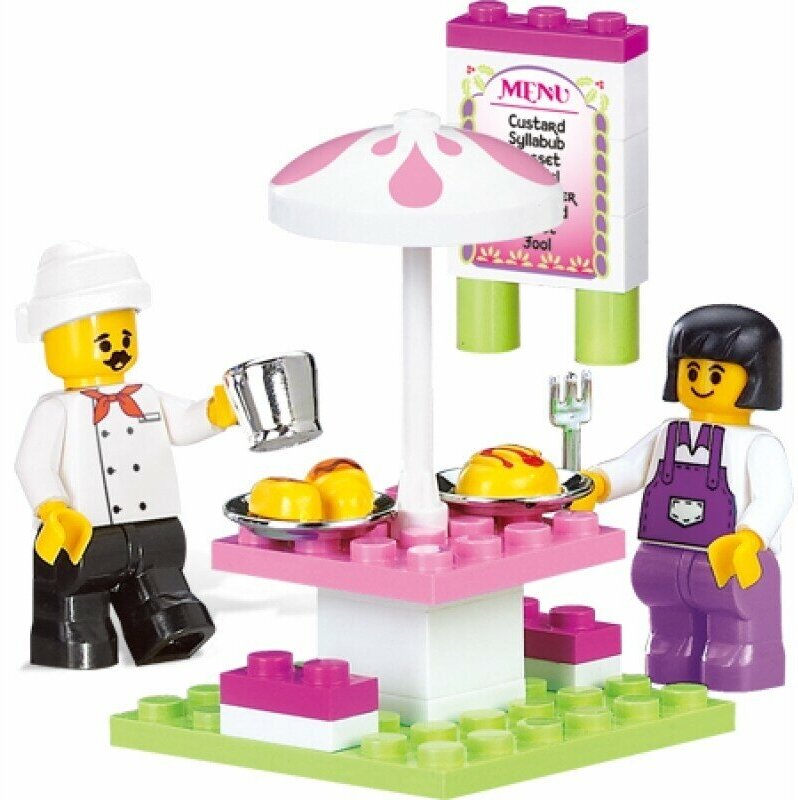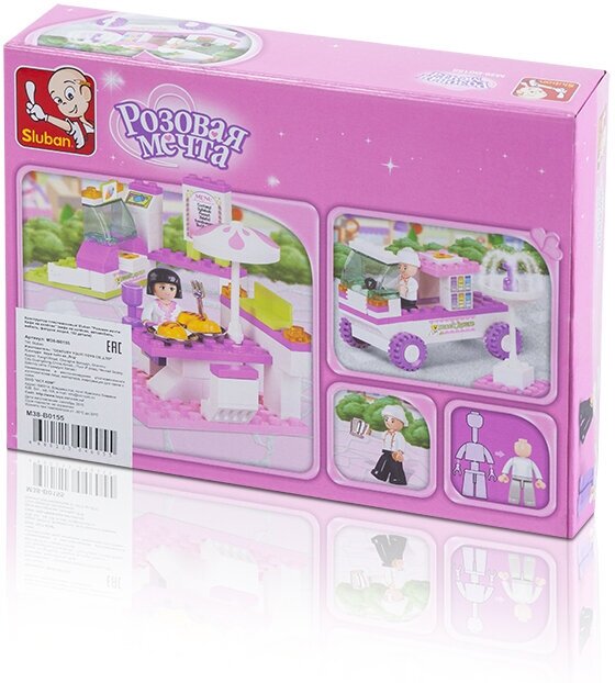 Конструктор «Розовая мечта», 102 элемента позволяет собрать из деталей фургон быстрого питания, столик с зонтиком, напольное меню. В комплектацию также входят фигурки повара и посетителя, а также много интересных элементов, вроде вилок бокалов и булочек, которые сделают игру в разы увлекательнее.