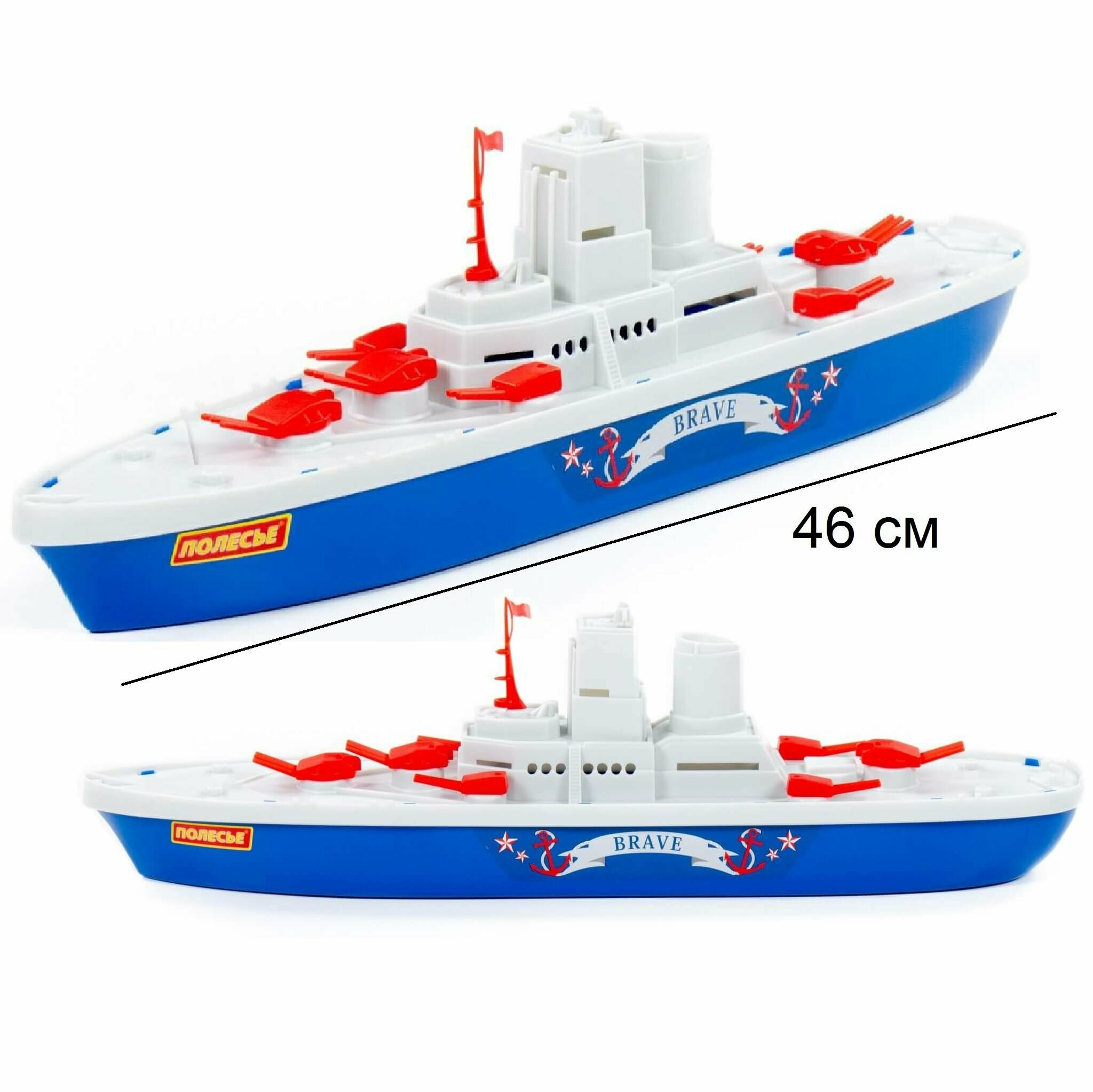 Крейсер Смелый представляет собой уменьшенную копию водного военного транспортного средства, изготовленную из пластика. Легкий кораблик отлично подойдет для игр в ванной и на пляже, и даже удачно дополнит сюжетно-ролевую игру на суше. Игрушка выполнена в сине-белых цветах, на корпусе располагается название судна на английском языке. На палубе установлены орудия красного цвета. Изделие порадует родителей качественным исполнением и идеально подогнанными деталями. Игры с корабликом способствуют развитию воображения, фантазии и цветового восприятия.
