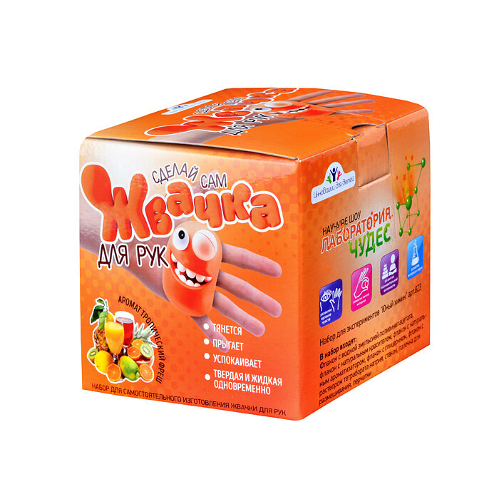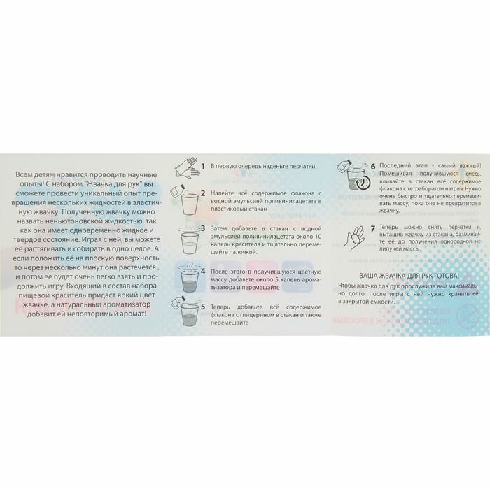 Развивающий набор "Жвачка для рук" позволит ребенку самостоятельно изготовить интересную игрушку. В наборе представлены специальные вещества, смешав которые ребенку удастся создать жвачку для рук, которая одновременно как жидкая, так и твердая. Это неньютоновская жидкость, которая становится твердой при резком физическом воздействии, например ударе, но пластична и мягка в обычном состоянии и при плавном сжатии. Игрушка не прилипает к рукам и имеет приятный аромат.