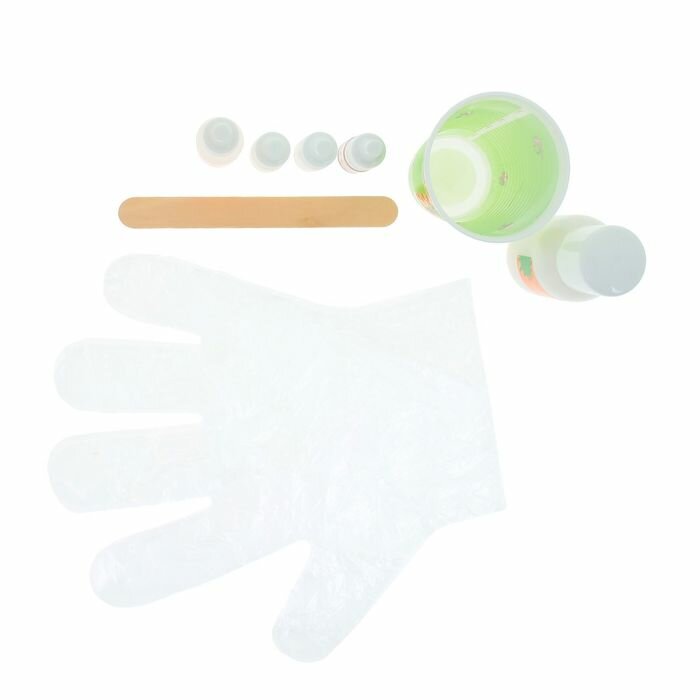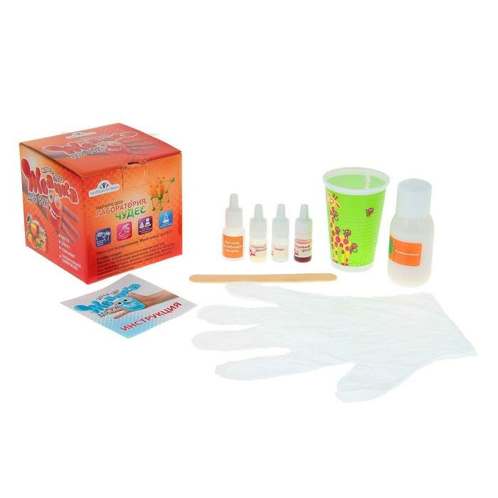 Комплектация : флакон с водной эмульсией поливинилацетата, флакон с натуральным красителем, флакон с натуральным ароматизатором, флакон с глицерином, флакон с раствором тетрабората натрия, стакан, инструкция, палочка для размешивания, перчатки.