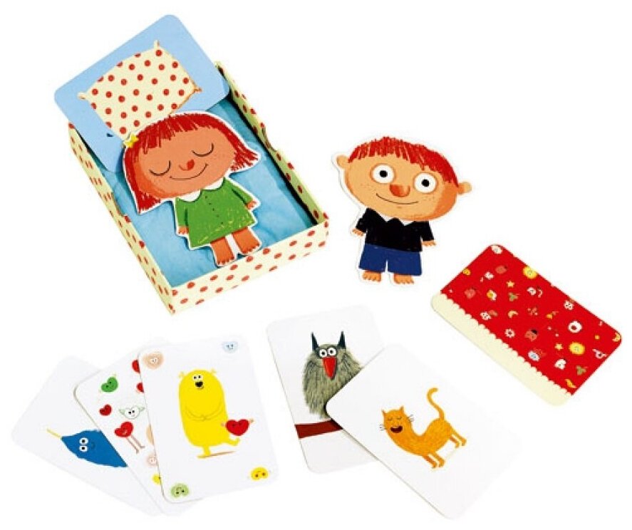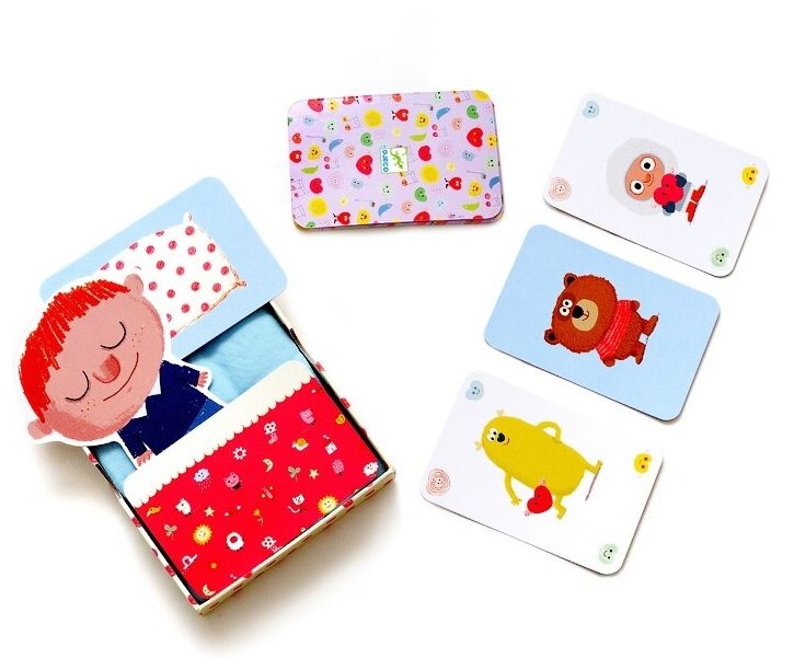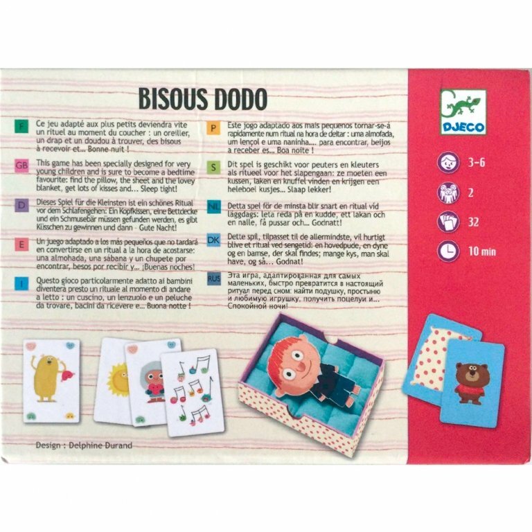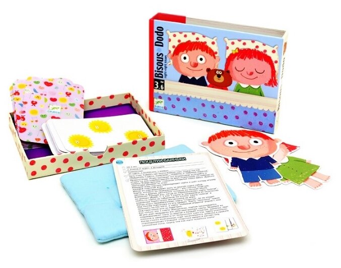 Djeco Детская настольная карточная игра Додо выделяется оригинальностью, она рассчитана на взаимодействие ребёнка и взрослого, вырабатывания привычного ритуала засыпания. Додо Djeco состоит из матраса, двух карт-персонажей и 32 карт-предметов. Сама игра додо Djeco предельно проста: ребёнок берёт из колоды карту за картой, постепенно собирая любимую игрушку, простыню и подушку. В процессе открывания карточек и выполнения заданий Djeco dodo можно успеть вволю потискать и зацеловать малыша, а также исполнить ему колыбельные. Без сомнения, спальня, где додо Djeco ждёт своего маленького друга, ассоциируется у малыша с приятным переходом от бодрствования ко сну. Колода состоит из 32 карт, 2 персонажа и 1 матрац Количество игроков: 1 игрок и 1 ведущий