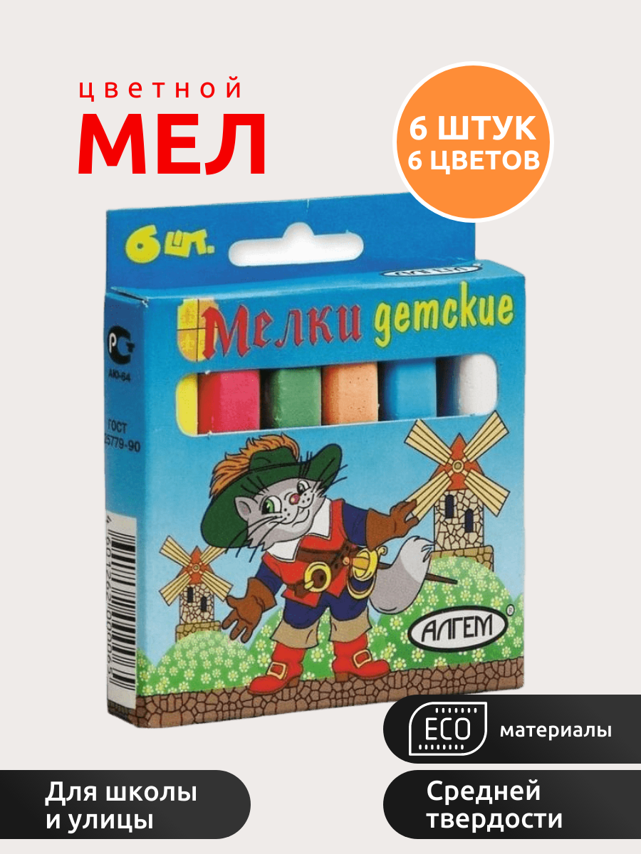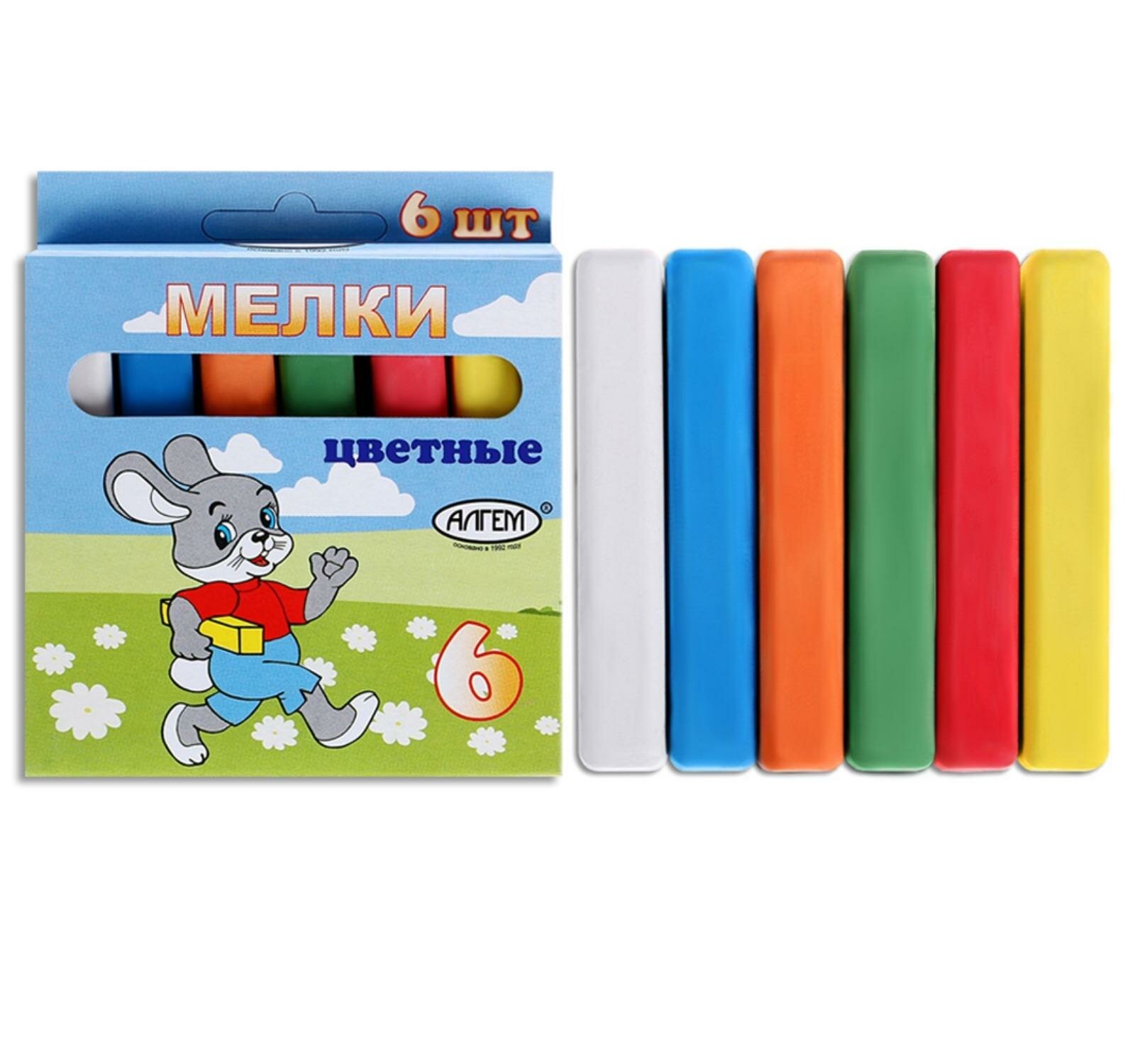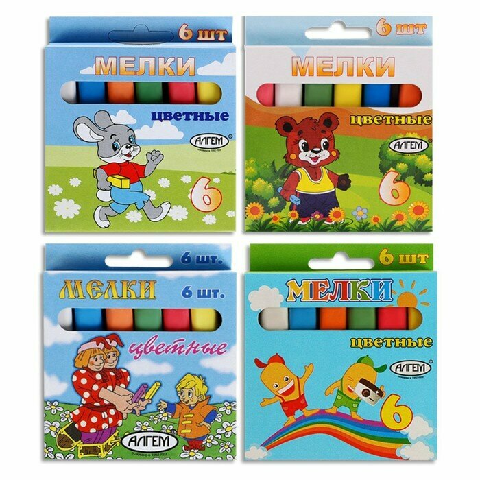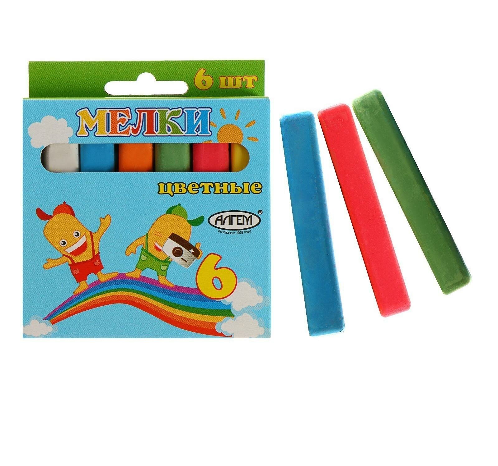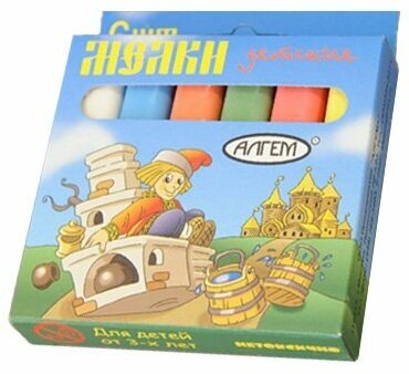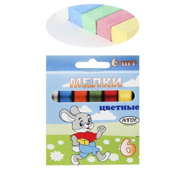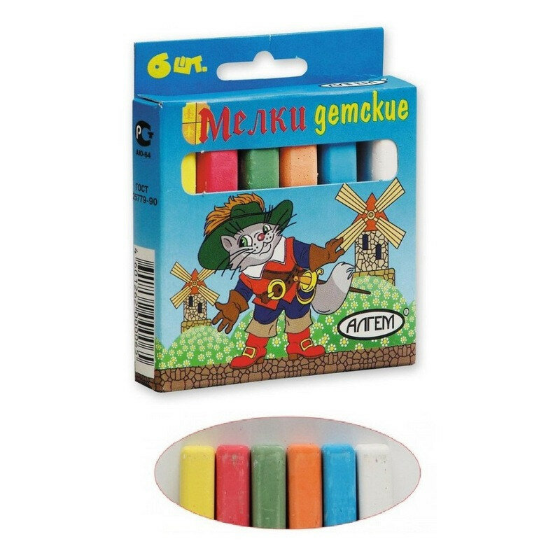 Набор цветных мелков поставляется в картонной коробке с окошком и европодвесом. В наборе шесть мелков разных цветов (по 13 г.), средней степени твердости. Подходит для письма и рисования на различных поверхностях, не оставляет царапин. Мел может использоваться детьми с младшего школьного возраста. Размер мелка — 78?14 мм.