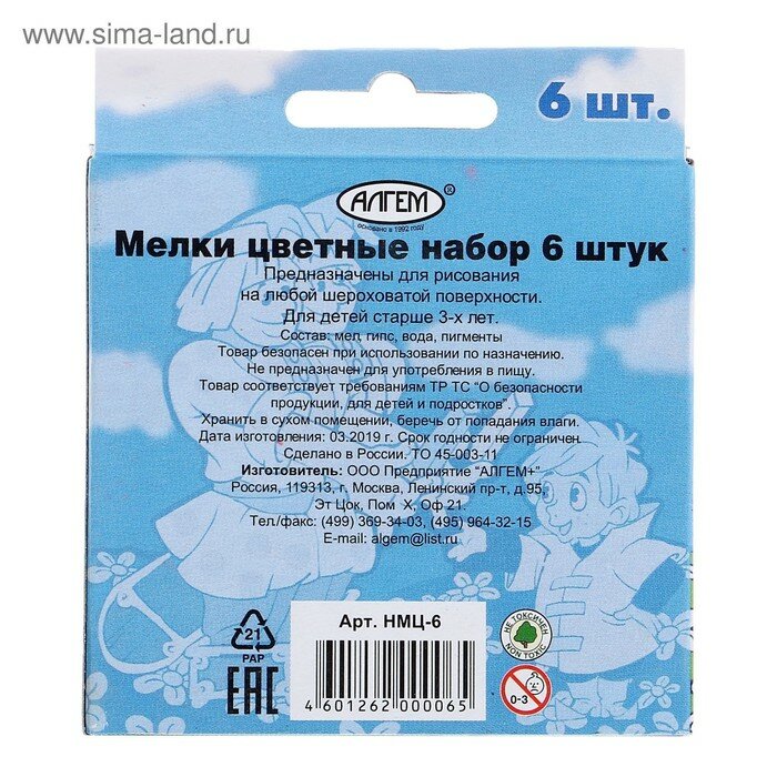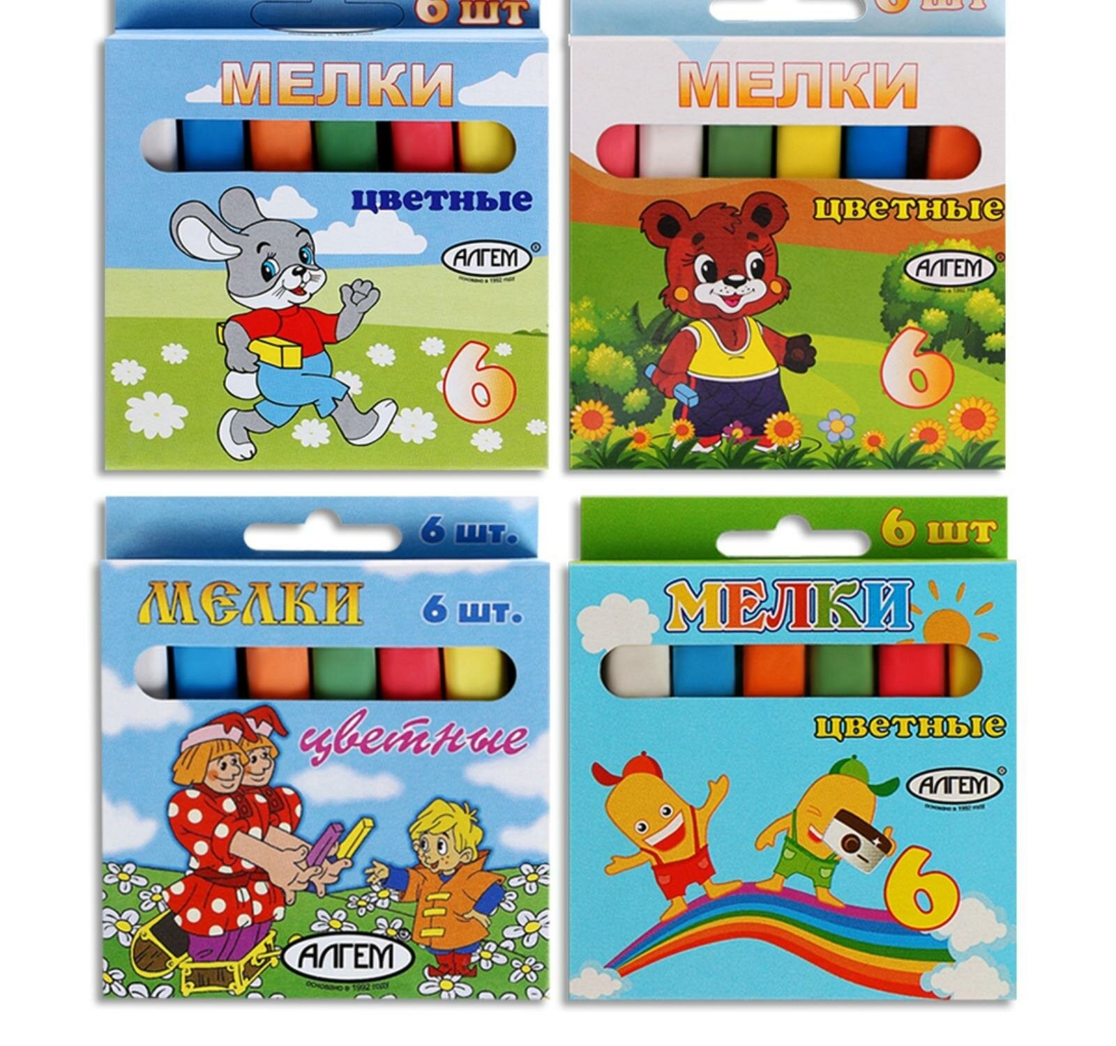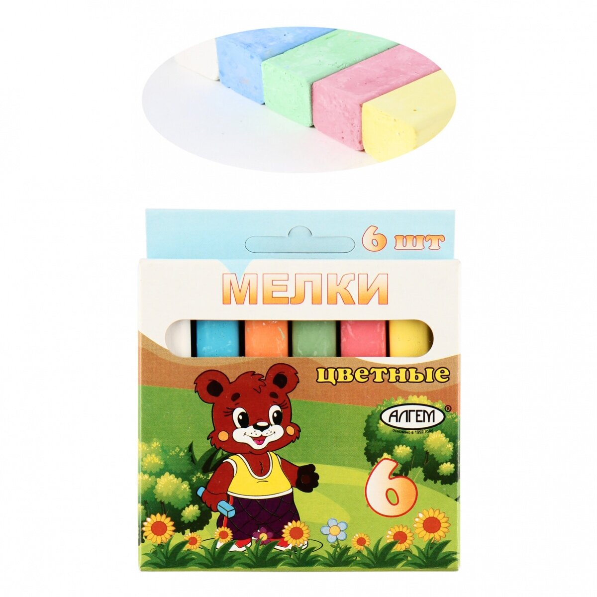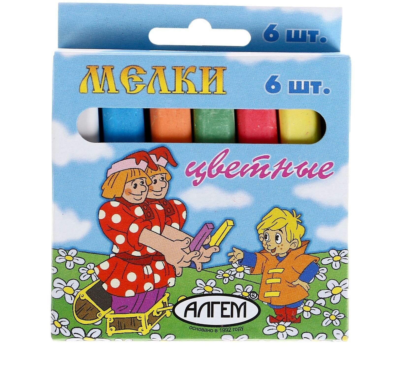 Набор цветных мелков поставляется в картонной коробке с окошком и европодвесом. В наборе шесть мелков разных цветов (по 13 г.), средней степени твердости. Подходит для письма и рисования на различных поверхностях, не оставляет царапин. Мел может использоваться детьми с младшего школьного возраста. Размер мелка — 78?14 мм.