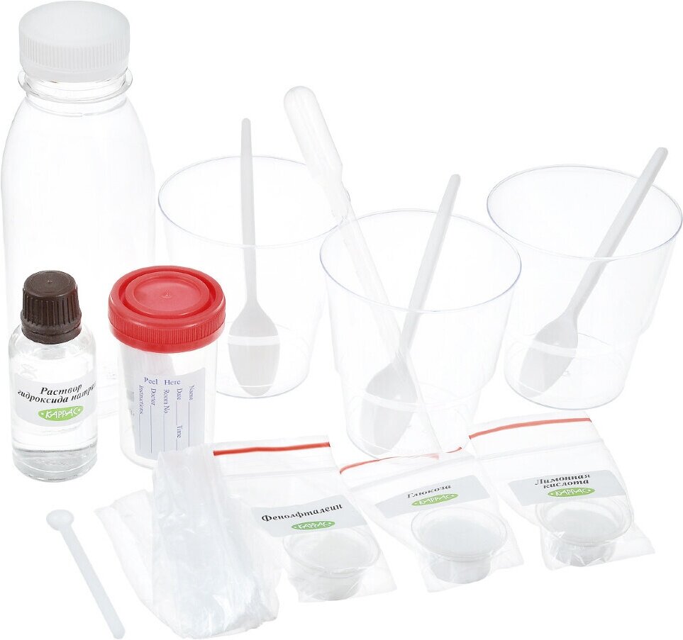 | Комплектация | раствор индигокармина, лимонная кислота, раствор гидроксида натрия, глюкоза, фенолфталеин, флакон, стаканчики, мерный стаканчик, мерная ложечка, ложка чайная, пипетка Пастера, перчатки. |