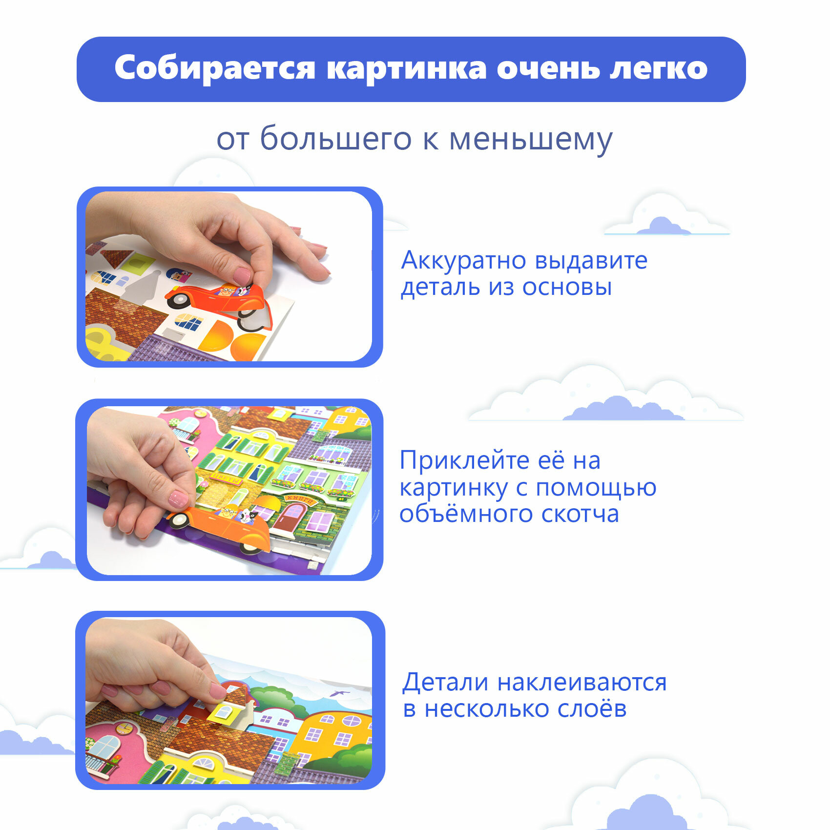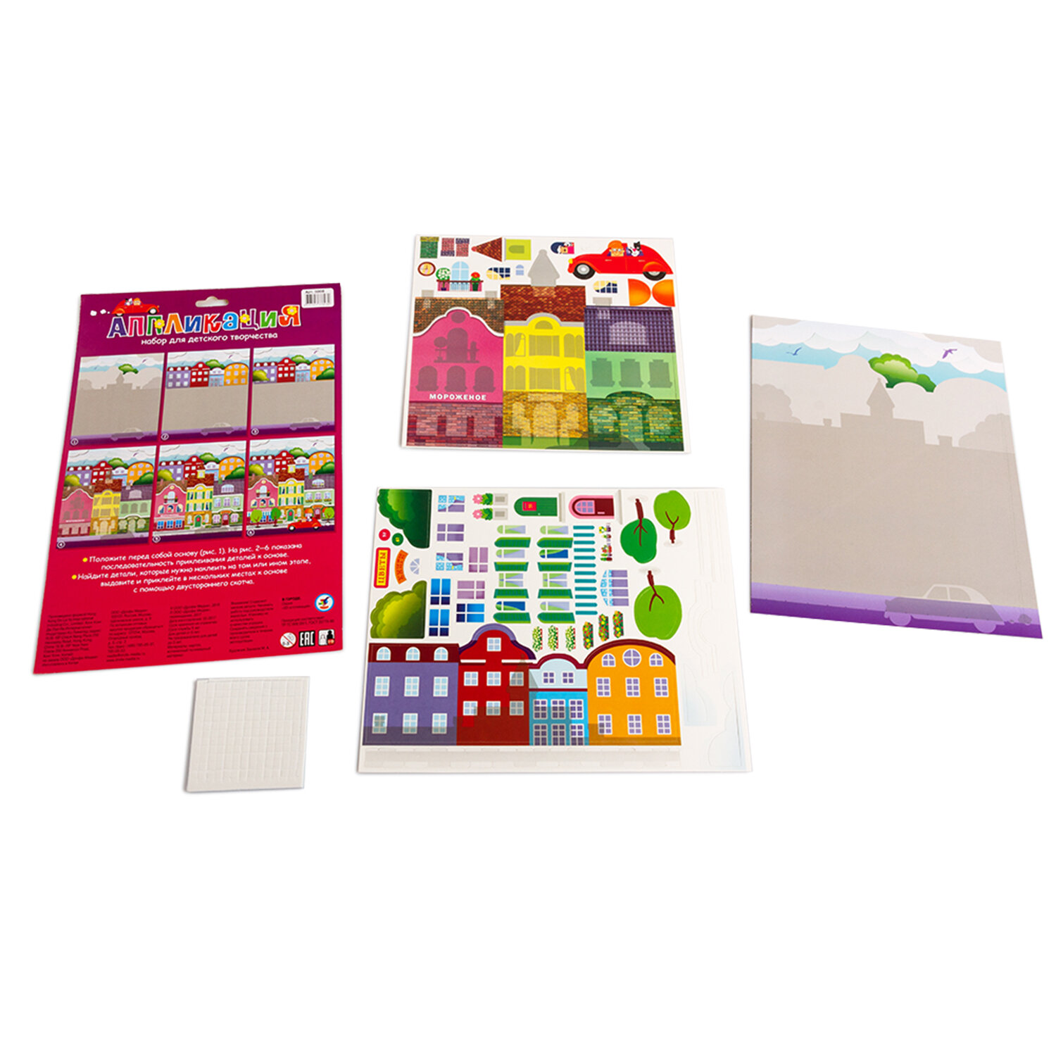| Состав набора | цветная основа с рисунком и схемой размещения деталей, детали, вырубленные из цветного картона, объёмный двусторонний скотч, цветная листовка-образец |