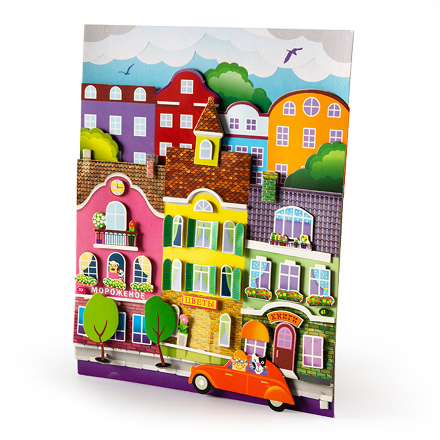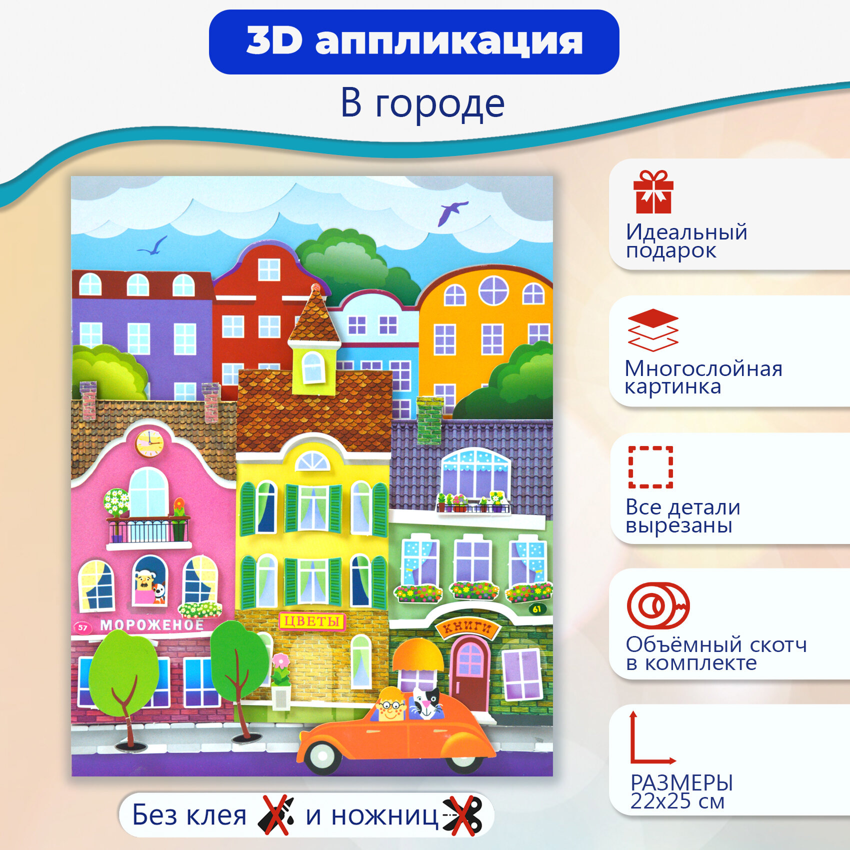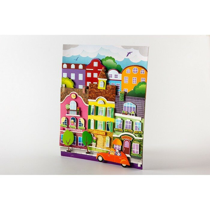 3D-аппликация — современный и очень увлекательный вид творчества. Данный набор позволит создать необыкновенно выразительную 3D-картину. Яркие и красочные детали изображения, выполненные из плотного картона, выступают над основой, создавая причудливый и сказочный мир. Этот удивительный 3D-эффект возникает благодаря использованию объёмного двустороннего скотча. Готовое изделие смотрится необыкновенно эффектно.