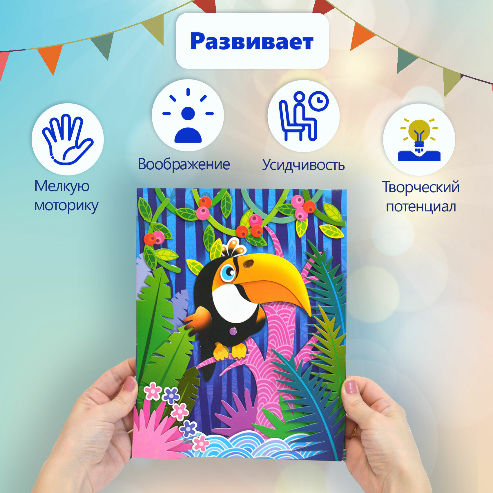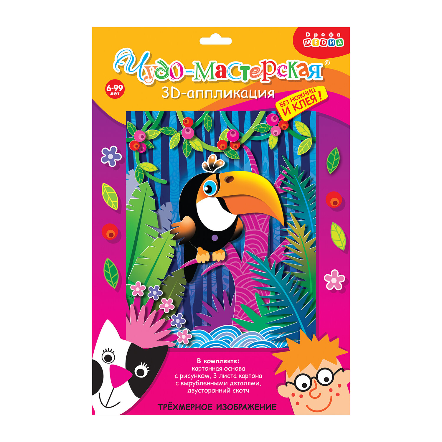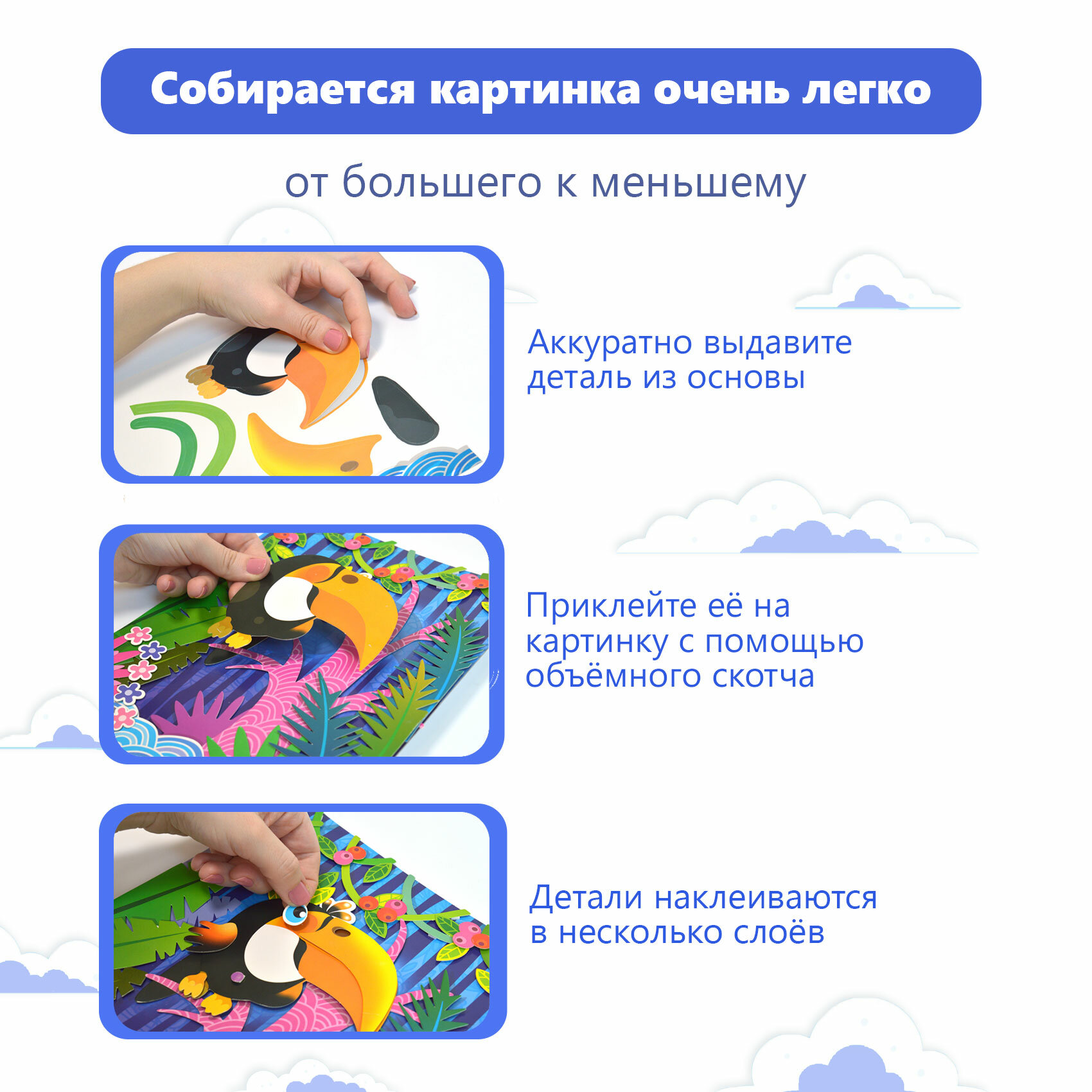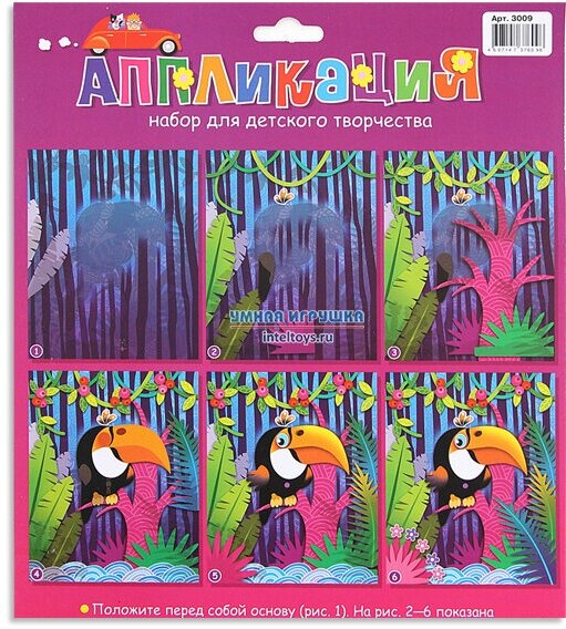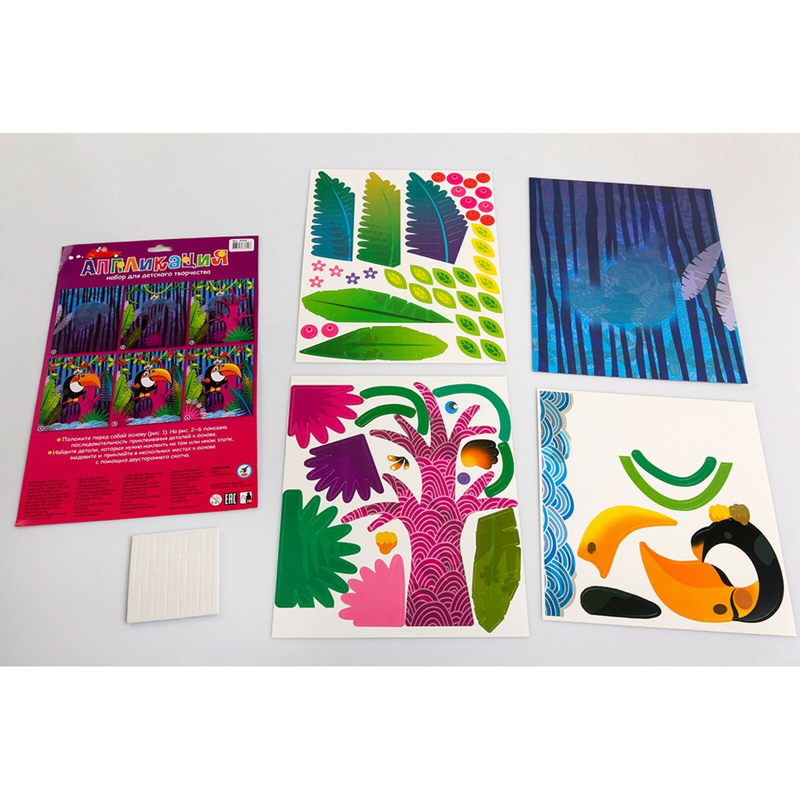 | Состав набора | цветная основа с рисунком и схемой размещения деталей, детали, вырубленные из цветного картона, объёмный двусторонний скотч, цветная листовка-образец |