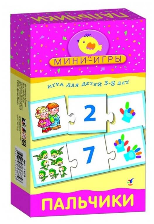 Настольная мини-игра "Пальчики" познакомит ребенка с цифрами от 1 до 10. Игра развивает умение соотносить действие своих пальчиков с называемым числом, закрепляет навыки прямого и обратного порядкового счета, учит соотносить количество предметов и пальчиков с цифрой. В набор входят 30 карточек с яркими картинками и правила игры на русском языке. Настольная игра развивает мелкую моторику рук, воспитывает самостоятельность, логическое мышление и умение оценивать свои действия.