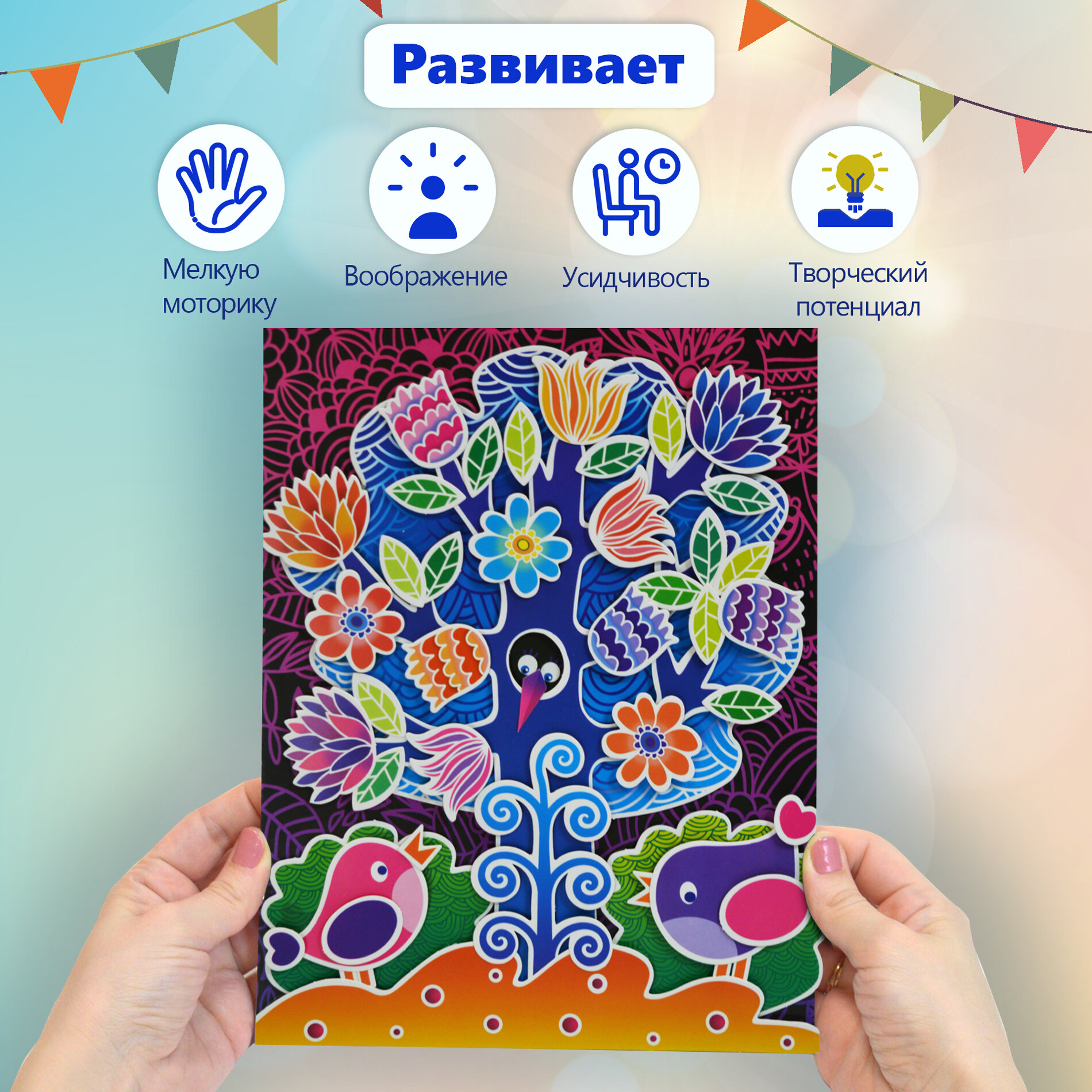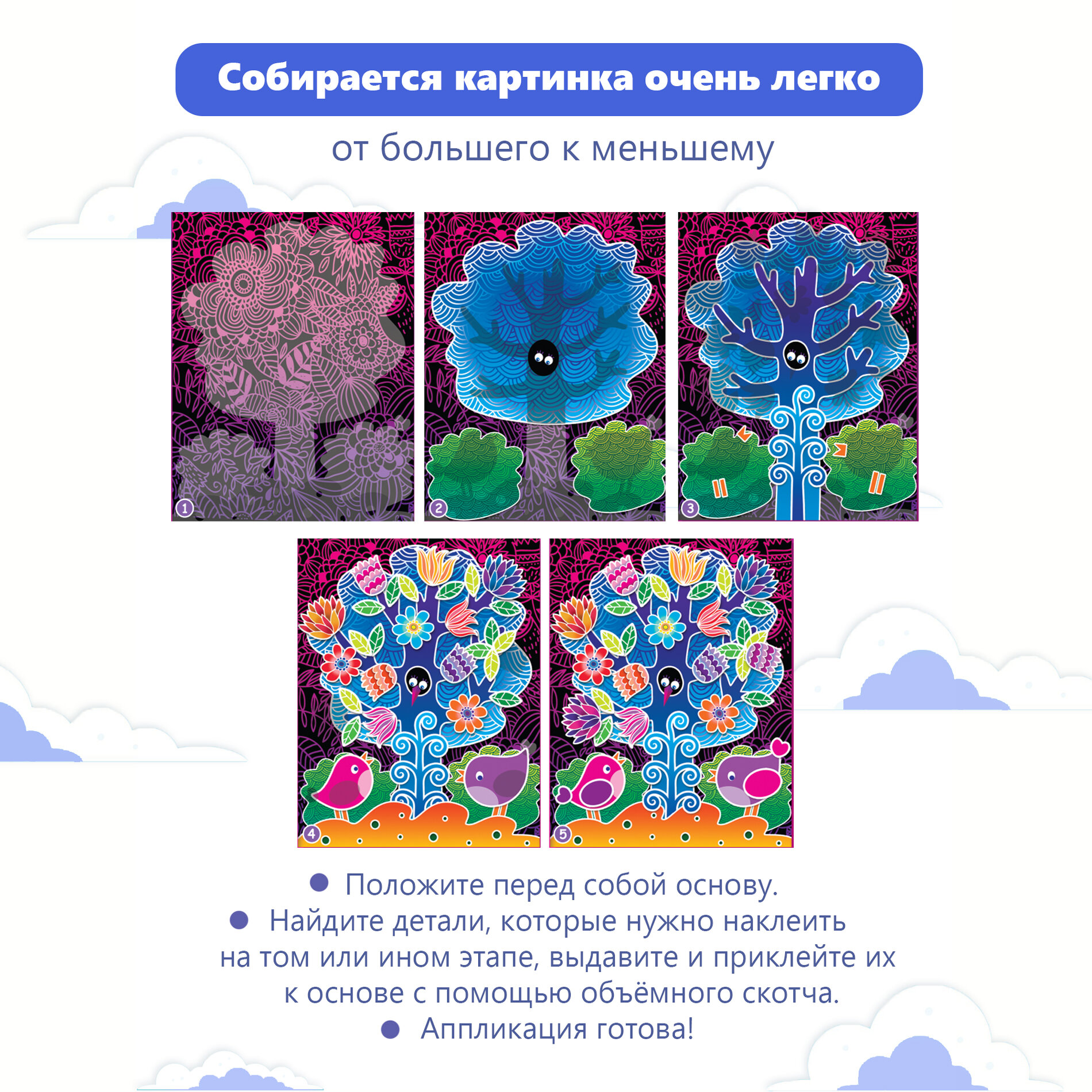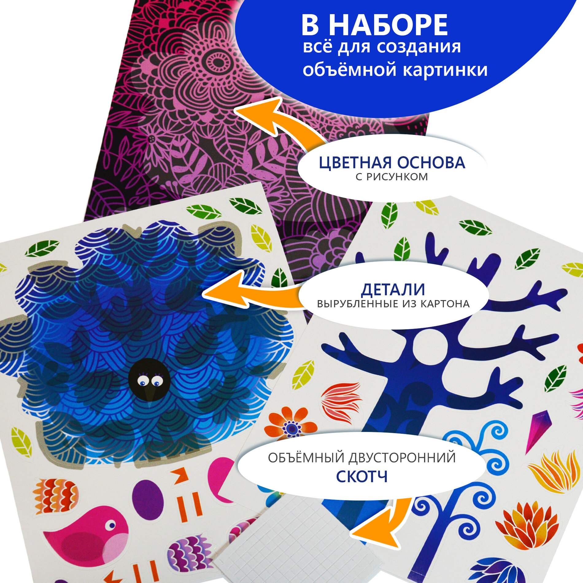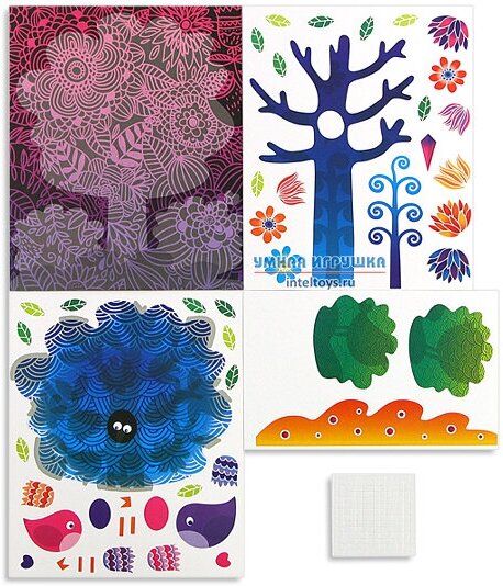 | Состав набора | цветная основа с рисунком и схемой размещения деталей, детали, вырубленные из цветного картона, объёмный двусторонний скотч, цветная листовка-образец |