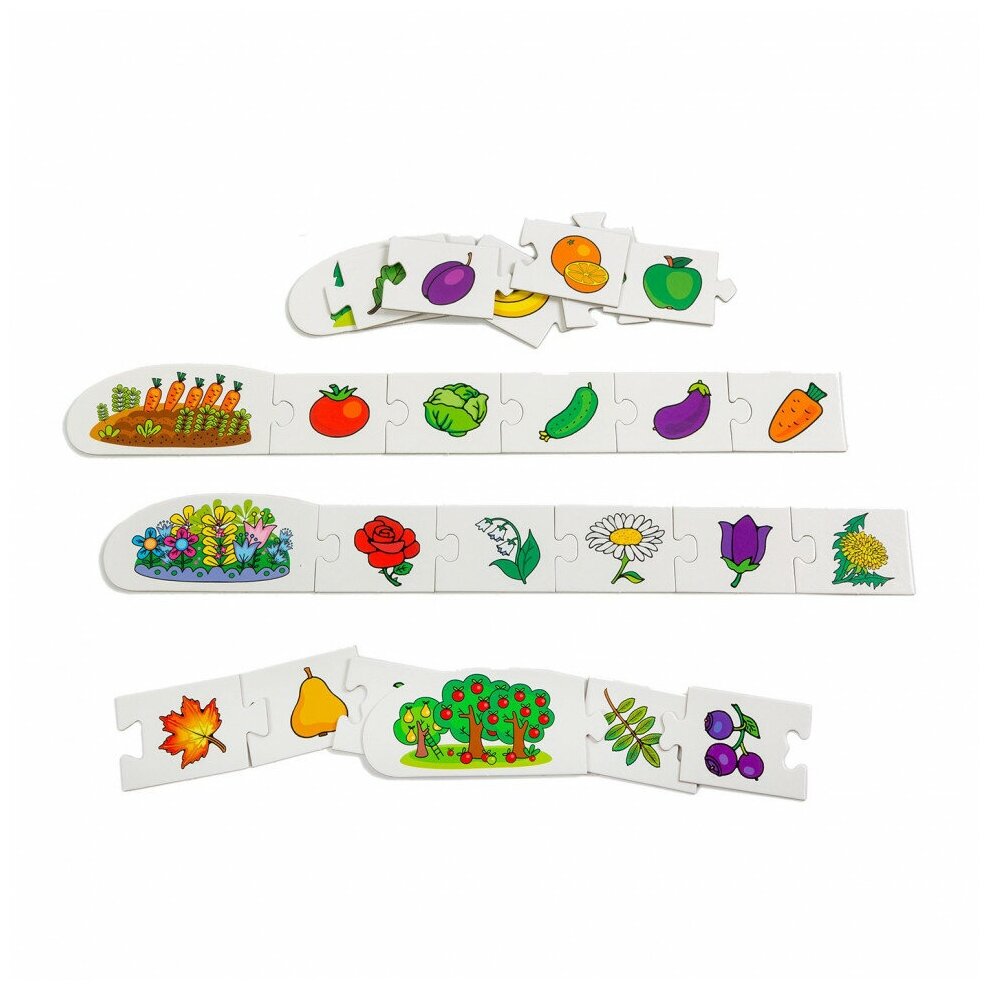 Эти игры помогут малышам сделать первые шаги в формировании и развитии основных знаний, умений и навыков, необходимых дошкольнику. Дети научатся различать цвета, основные геометрические фигуры и формы, соединять две половинки в целое, сравнивать, соотносить, выделять признаки предметов, классифицировать и объединять их в группы, составлять рассказ по картинке, находить причинно-следственные связи между предметами и объектами, познакомятся с буквами, цифрами и порядковым счетом. Составляя цепочки из карточек с пазловыми замками, ребенок учится логически мыслить, размышлять и самостоятельно оценивать правильность своих действий. Игры развивают восприятие, память, внимание, речь, умение анализировать свои действия. Каждая игра содержит несколько вариантов правил, различающихся уровнем сложности, что делает игры интересными для детей разного возраста. В набор входят 30 игровых карточек.