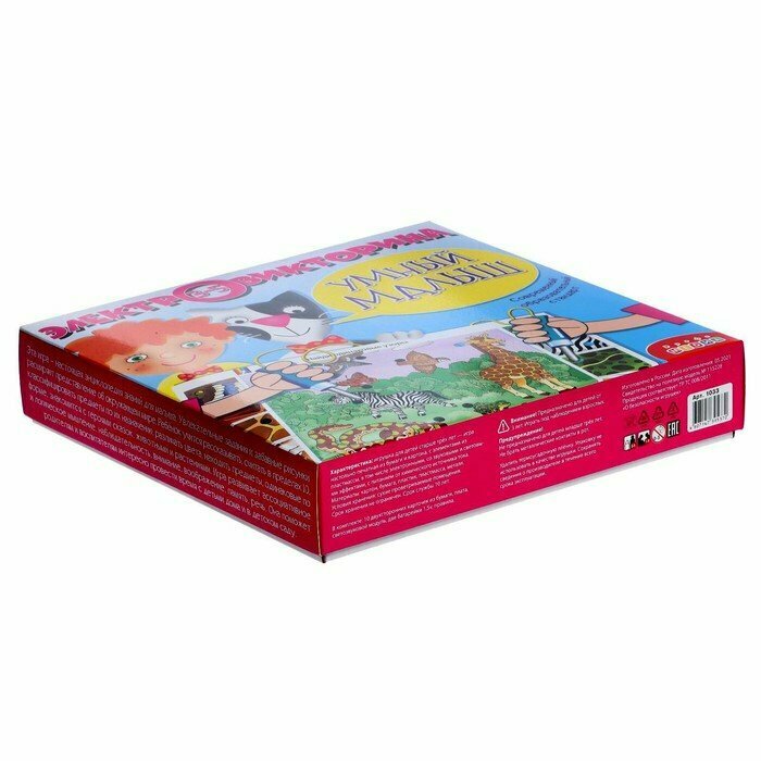 Разработанные в соответствии с программами дошкольного и начального образования, игры помогут ребёнку подготовиться к школе, лучше понять материал учебника и творчески подойти к выполнению домашних заданий. Соединив отверстия на двух изображениях игровой карты, которые, по мнению ребенка, связаны между собой, он сможет самостоятельно определить правильность своего ответа: при верном соединении контактов загорается лампочка и звучит музыка. Игра развивает наглядно-образное мышление, произвольное внимание, память, речь, расширяет кругозор. Играя, ребенок учится рассуждать, сопоставлять, сравнивать, устанавливать простые закономерности, принимать самостоятельные решения и проверять правильность их выполнения, доказывать и обосновывать свой выбор. В процессе игры у ребенка появляется интерес к знаниям, воспитывается усидчивость, вырабатываются навыки самоконтроля и самопроверки. Темы карточек: Назови одним словом Отыщи похожее Соедини половинки Круг и овал Звериная столовая Чего не хватает? Первая буква слов Помоги героям сказок Одинаковые и разные фигуры У каждого свой дом Знание и узнавание цветов Разные возраста Сходства разных предметов Составь пары Предметы и их функции Где чей плод? Счёт до 10 Что кому принадлежит? Узнай животное по узору Комплектация: 10 двухсторонних карточек, плата, светозвуковой модуль, жетоны, правила. Игра для детей 3—5 лет.