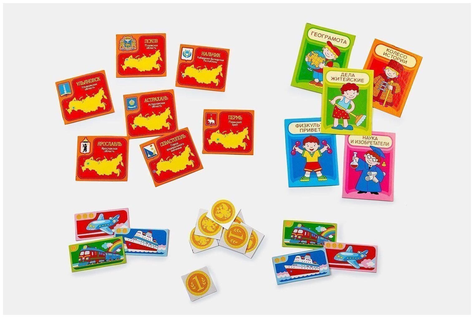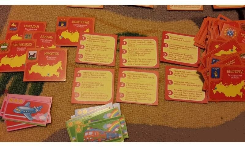 | Состав набора | игровое поле - 1 шт., карточки с вопросами большие - 60 шт., карточки с вопросами маленькие - 83 шт., карточки-билеты - 18 шт., карточки-монеты - 48 шт., информационная карточка - 1 шт., фишки - 6 шт., кубик - 1 шт., правила с ответами - 1 шт. |