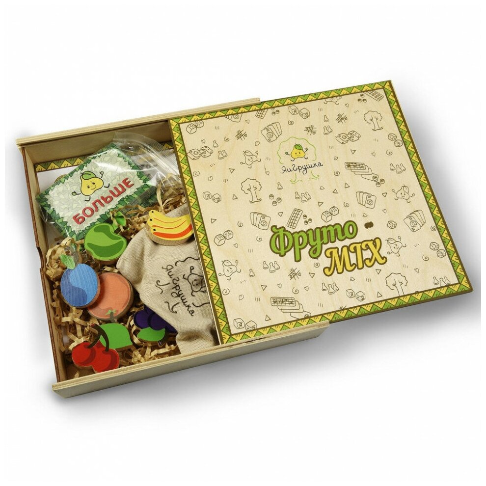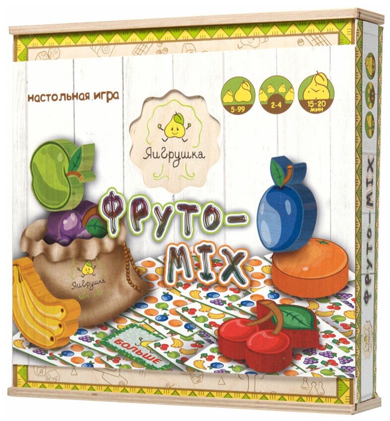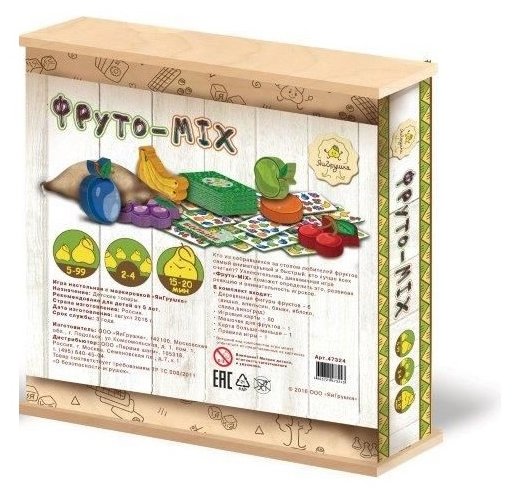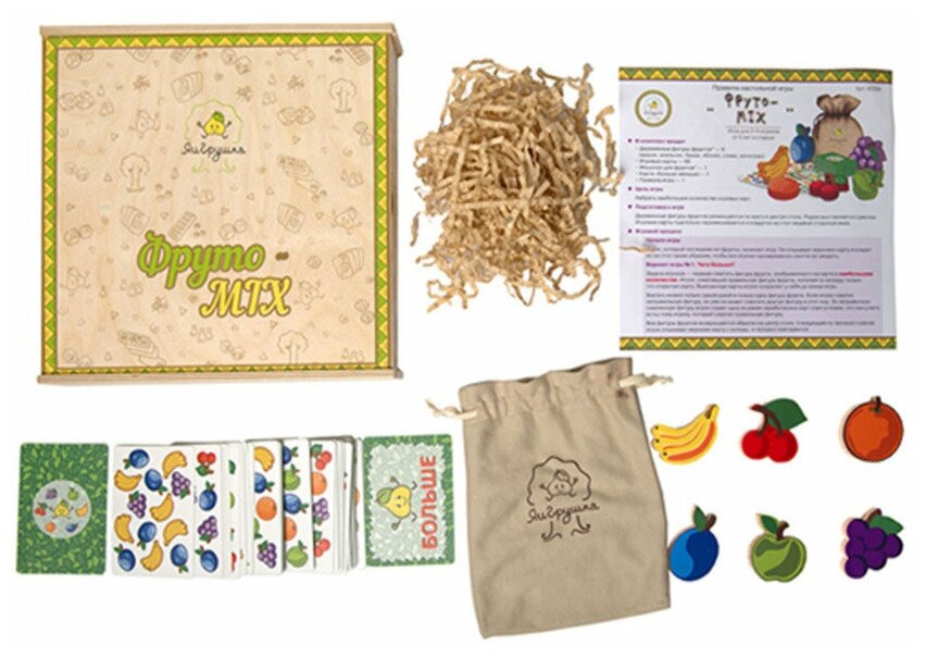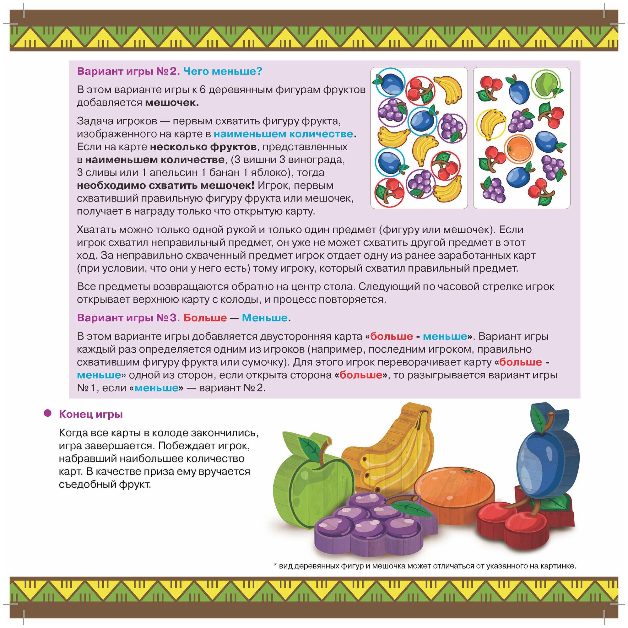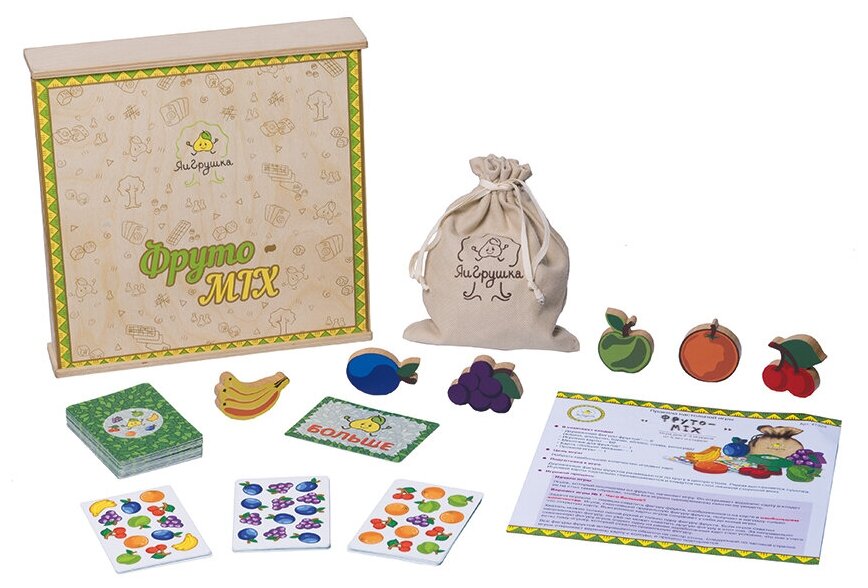 | Состав набора | 6 фигурок фруктов, 60 карточек, 1 карта больше-меньше, мешок, правила игры |