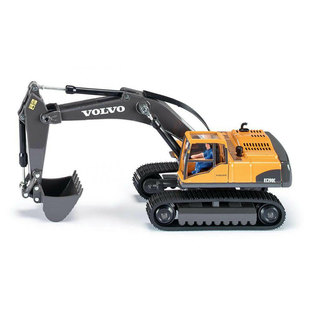 Игрушечная модель - гусеничный экскаватор Volvo EC 290. Корпус выполнен из металла, кабина из пластика, стёкла из прозрачной пластмассы. Стрела экскаватора и ковш подвижные, гусеницы выполнены из резины и подвижны, экскаватор можно катать. В кабине фигурка экскаваторщика.