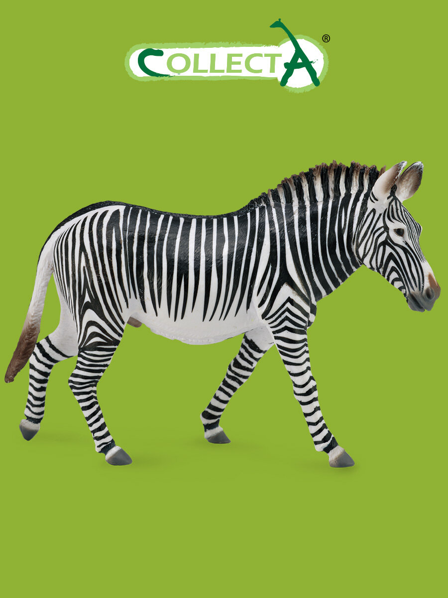 Коллекционная фигурка Зебра Греви, как и все изделия Collecta, невероятно реалистична. Раскрашенная вручную, она выглядит очень правдоподобно. Зебры Греви являются самыми крупными в своем семействе. У них достаточно длинное тело и они отличаются плотным строением тела, в отличие от иных стройных и легких зебр. Эти особенности переданы в фигурке, равно как и более частые тонкие полоски, также выделяющие этот вид.