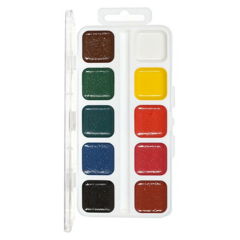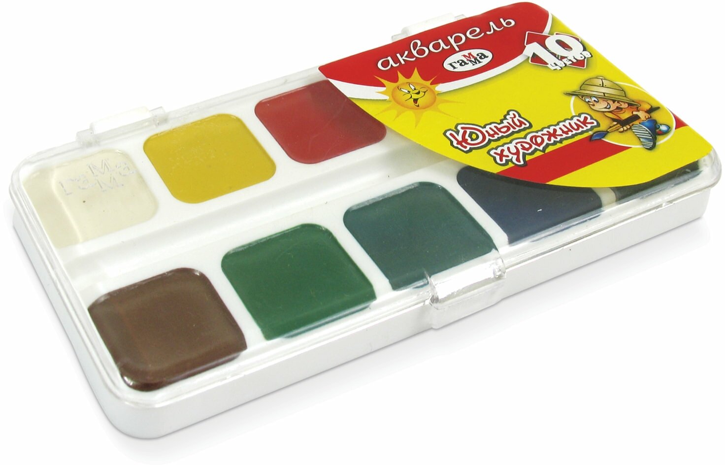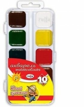 Акварельные краски под название Юный художник производства Гамма разработаны специально для самых маленьких любителей рисовать, подходят для уроков изобразительного искусства в начальной школе. В наборе 10 разноцветных акварелей. Это стойкие краски с высокой степенью яркости. Они легко смешиваются для получения новых оттенков и легко наносятся на бумагу.