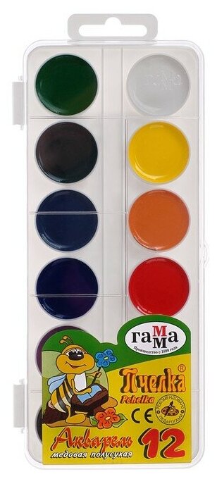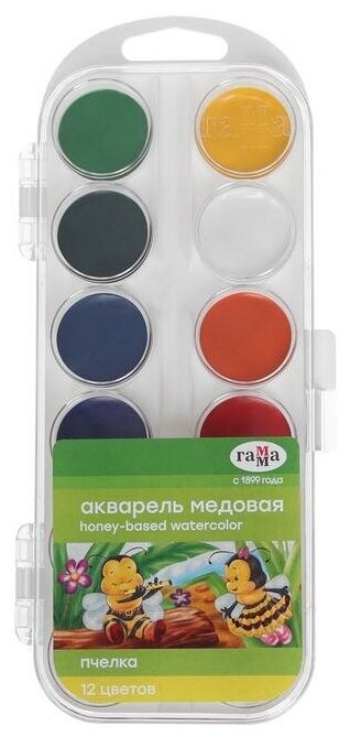 Для детей старше 3 лет. Акварель медовая Гамма Пчелка отлично подходит для ребенка, который только начинает осваивать техники рисования растворимыми красками. Набор содержит 12 разноцветных акварельных красок в кюветах. Натуральные краски хорошо растворяются в воде. Органические ингредиенты не вызывают у детей аллергии. Пластмассовый пенал герметично закрывается и легко открывается.