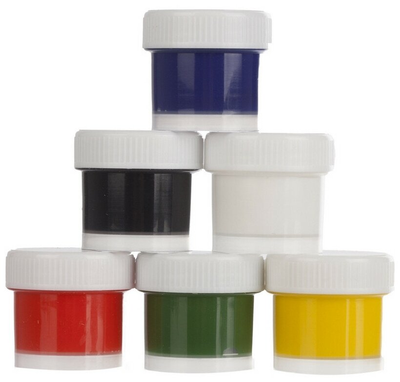 Набор: 6 цветов в баночках, объем краски одного цвета: 15 мл.