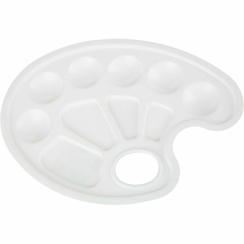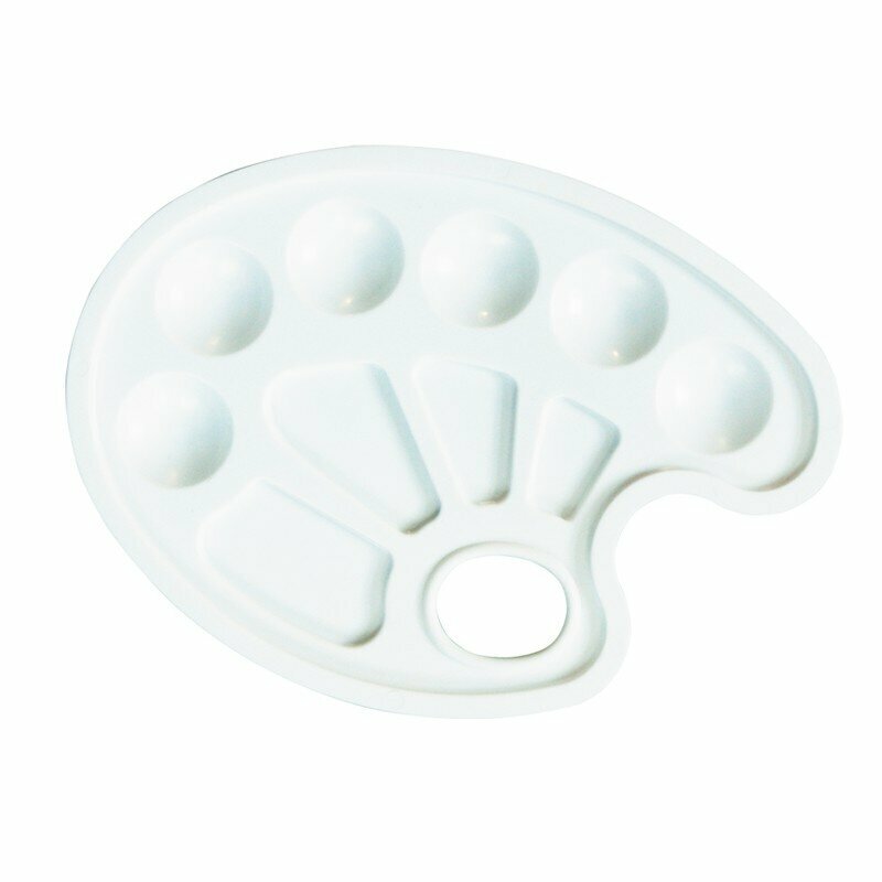 Палитра из пластмассы овальной формы с отверстием для удобства держания в руке, для смешивания красок.
