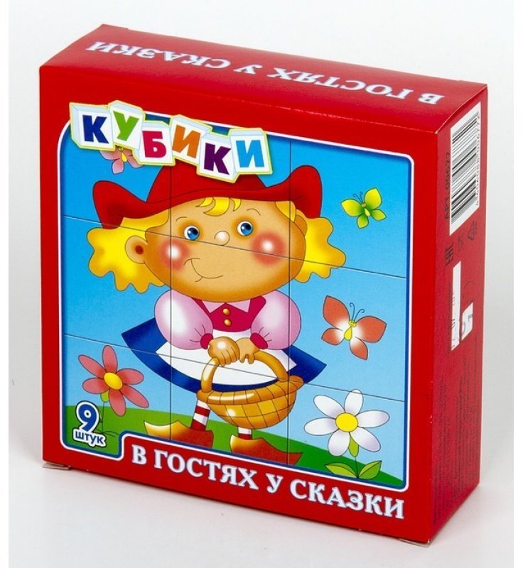 Собрать шесть красочных и простых картинок с персонажами детских сказок из девяти кубиков вполне по силам любому ребенку в возрасте от трех лет. Особенно, если он ранее уже собирал картинки из 4 или 6 кубиков.В результате игровой деятельности малыш прекрасно развивает внимание, память, речь, воображение, расширяет кругозор и словарный запас.Набор «В гостях у сказки» выполнен по технологии прямой печати (без обклейки), поэтому изображения на кубиках более долговечные, меньше подвержены абразивному износу и еще долго будут радовать малыша сочными и яркими красками.