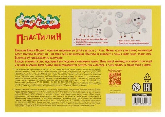 Пластилин Каляка-Маляка® - это формула классического пластилина высокого качества. Маленькие любители творчества без труда смогут смять брусок и придать ему нужную форму. Имеет яркие сочные цвета, мягко растягивается и не рвется, прекрасно держит форму. При этом не окрашивает руки, не прилипает и не оставляет масляных пятен. Изготавливается на современном российском производстве, соответствует всем стандартам безопасности детской продукции.