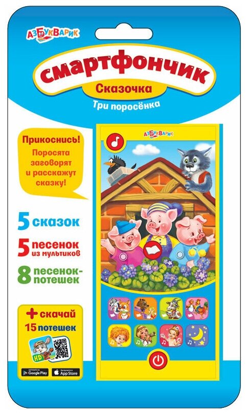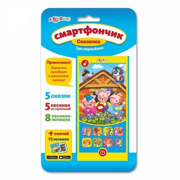 Смартфончик "Сказочка. Три поросенка" Азбукварик Смартфончик торговой марки Азбукварик является отличным подарком для мальчиков и девочек. Игрушка выполнена в виде сенсорного телефона, на экране которого расположено изображение героев сказки "Три поросенка" и восемь кнопок-картинок. Нажимая на клавиши и рисунок, ребенок сможет прослушать известные сказки, песенки и веселые потешки. Также внутри упаковки есть QR-код для бесплатного скачивания 15 интерактивных потешек на смартфон или планшет.