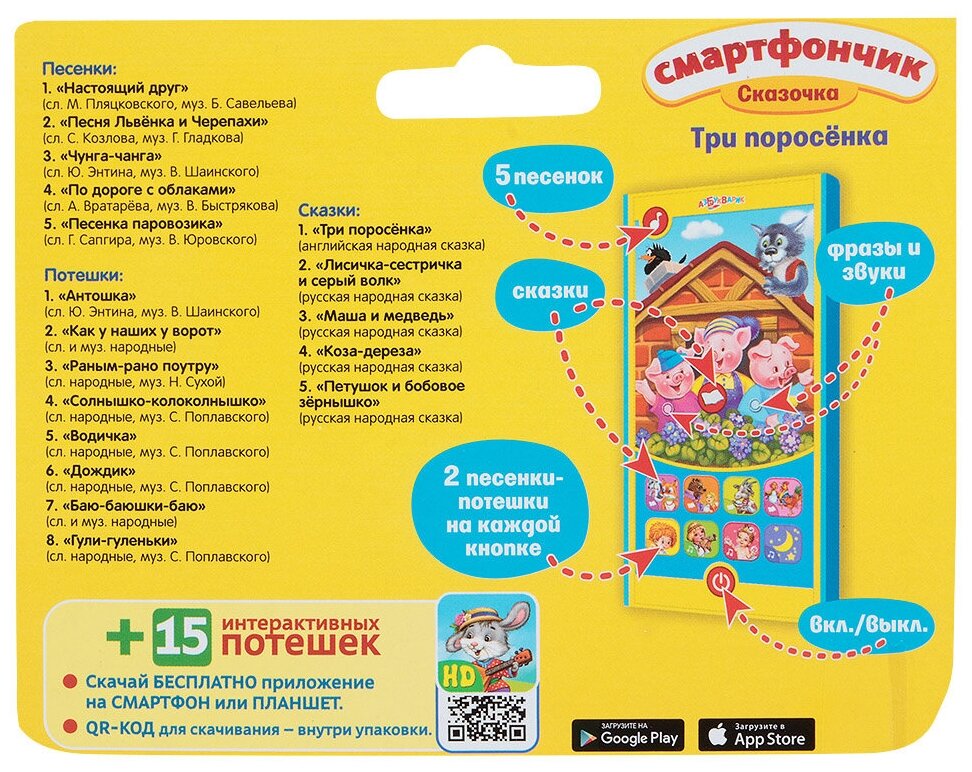 Смартфончик Три поросенка содержит 18 композиций (песен, сказок, потешек), которые веселят и обучают вашего малыша. Помогите ребенку расширить словарный запас и пополнить свой репертуар! Для детей от 2 лет.