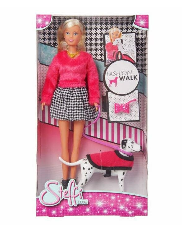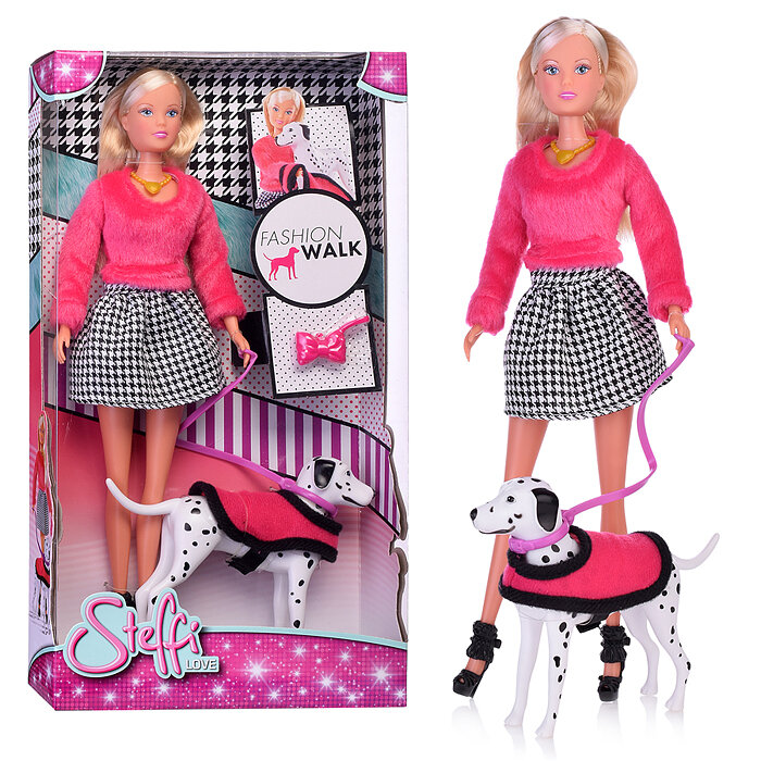 Штеффи - это милая кукла, выполненная в виде молодой девушки, которая вышла на прогулку с далматинцем. Сама по себе кукла выглядит очень стильно. Она одета в розовый свитер с длинным шерстяным ворсом розового цвета. Цвет этого свитера прекрасно сочетается как с золотистыми волосами Штеффи, так и с ее юбочкой, окрашенной в мелкую черно-белую клетку. Надо отметить, что дизайнеры очень интересно продумали стиль куклы и ее питомца, которые очень хорошо соответствуют друг другу. Так юбочка в черно-белую клетку соответствует естественному пятнистому окрасу породистой собачки. А розовая попона щенка сочетается со свитером хозяйки. Любая девочка сможет по достоинству оценить не только стильный образ самой куклы Штеффи, но и ее милого забавного питомца.