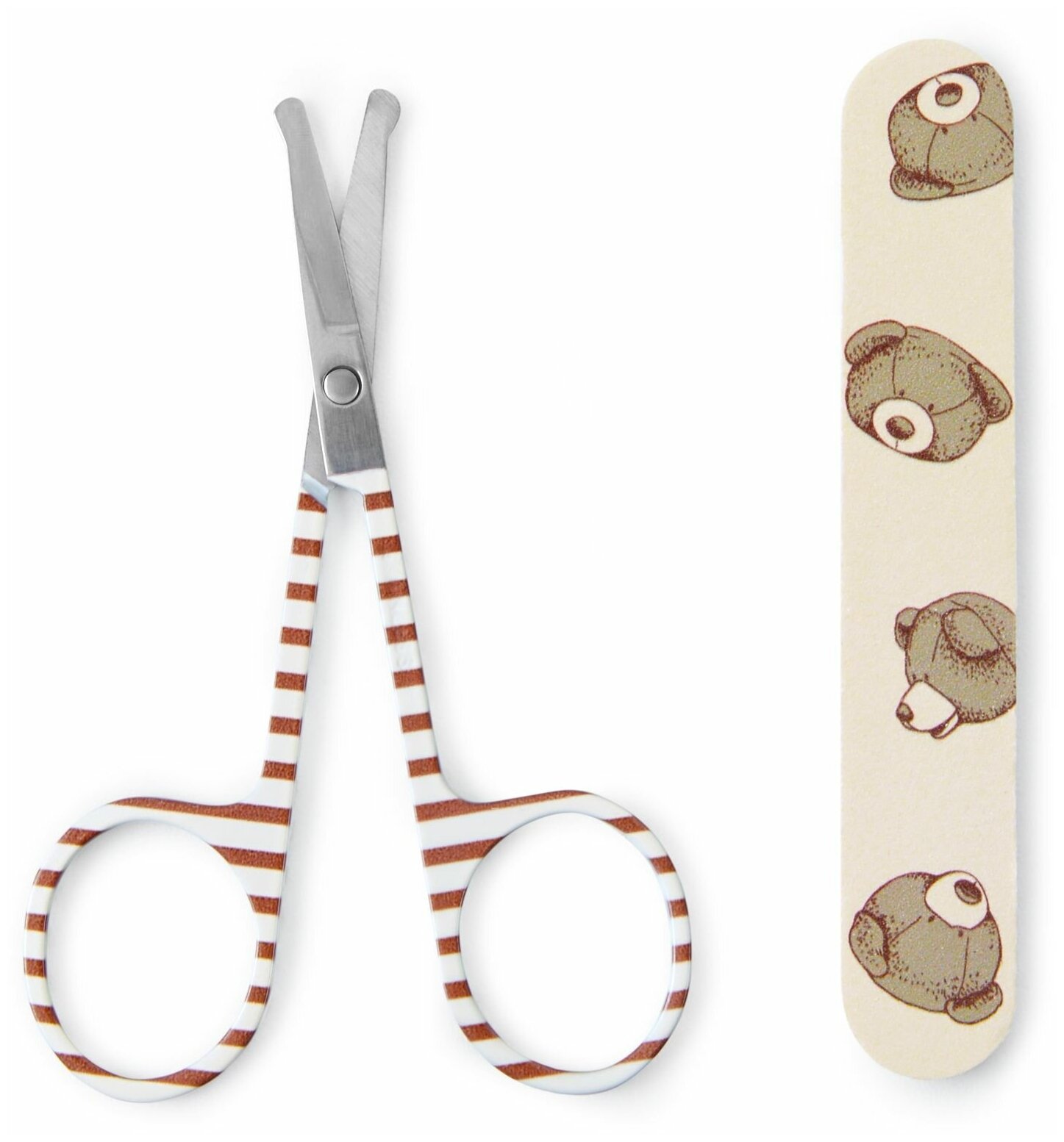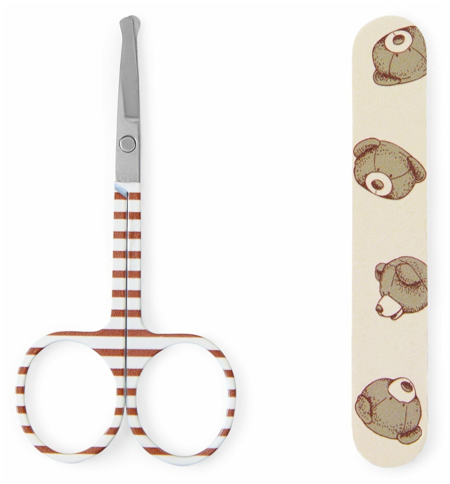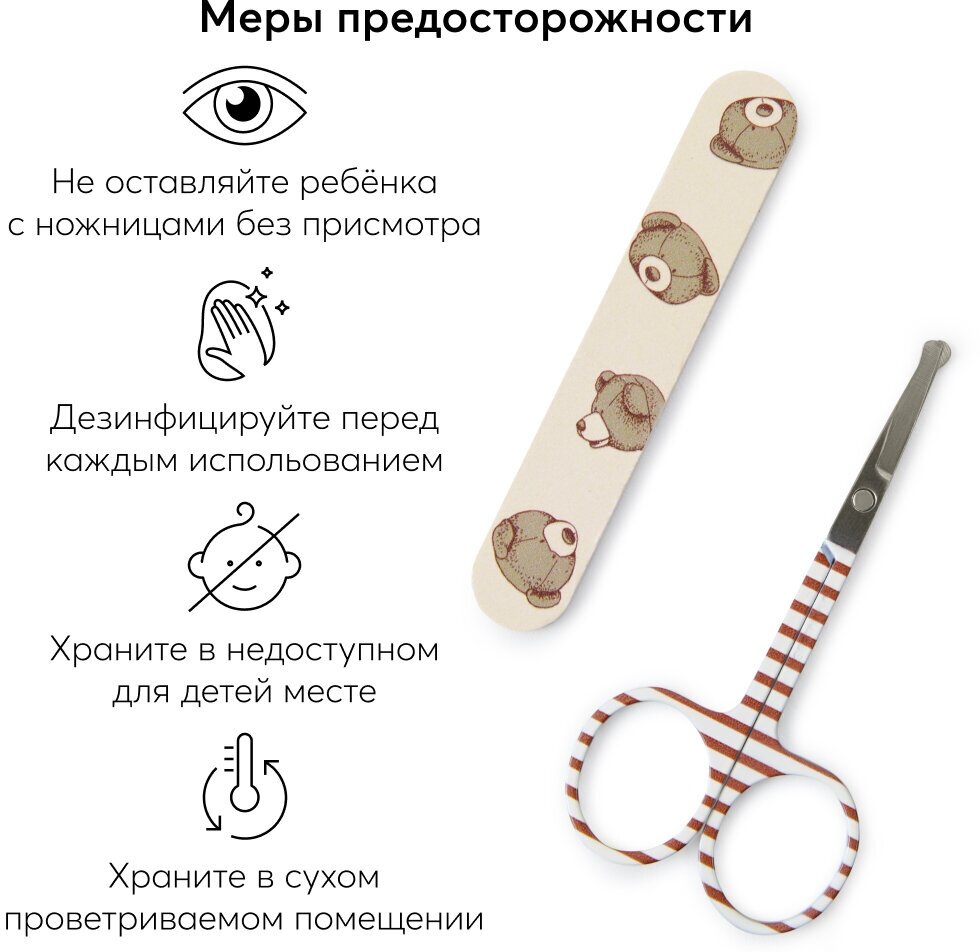 Простой и удобный в использовании маникюрный набор поможет маме в уходе за ногтями крохи. В комплект входит два предмета: ножницы и пилочка. Специальные безопасные ножницы с закругленными концами защищают от травмирования, при этом аксессуар легко и удобно держать в руке.