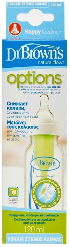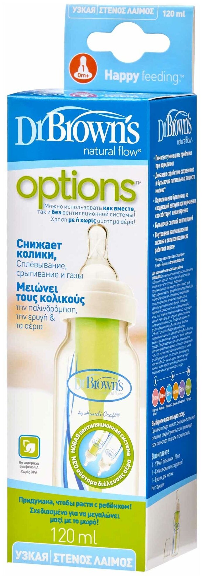 Бутылочка Dr.Brown’s Options с узким горлышком 120 мл полипропилен поможет предотвратить возникновение колик у малыша, обеспечивая кормление в комфортном для него темпе без образования вакуума благодаря вентиляционной системе Options. Она также способствует максимальному сохранению полезных питательных веществ в содержимом бутылочки. Однако теперь можно использовать бутылочки как вместе, так и без вентиляционной системы.