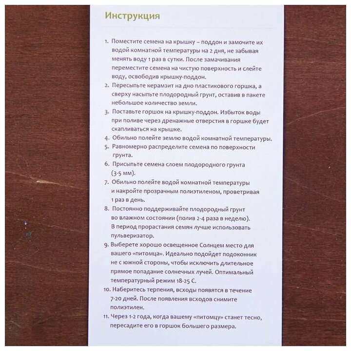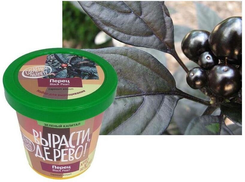 Перец декоративныйЧерный Жемчуг(Capsicum annuum). Семейство – пасленовые.Родина – Тропики Центральной и Южной Америки. Многолетнее растение, которое может достигать в горшке размеров до 0,5 метра. Вырастает за один сезон. Декоративный сорт перца чили. Превосходно подходит для домашнего выращивания. Чёрная жемчужина - это жгучий сорт с ярким ароматным вкусом стручков. Великолепный сорт, с фиолетовой листвой и фиолетово-черными круглыми плодами размера вишни. При созревании стручки меняют цвет на тёмно-красный. Высота куста до 25 см. С каждым годом куст все пышнее. Светолюбивое растение, на южном окне требующее притенения. Яркий свет необходим для завязывания плодов. Нуждается в частом поливе летом, который при созревании плодов необходимо сокращать. Инструкция 1. Поместите семена на крышку – поддон и замочите ихводой комнатной температуры на 2 дня, не забываяменять воду 1 раз в сутки. После замачиванияпереместите семена на чистую поверхность и слейтеводу, освободив крышку-поддон.2. Пересыпьте керамзит на дно пластикового горшка, асверху насыпьте плодородный грунт, оставив в пакетенебольшое количество земли.3. Поставьте горшок на крышку-поддон. Избыток водыпри поливе через дренажные отверстия в горшке будетскапливаться на крышке.4. Обильно полейте землю водой комнатной температуры.5. Равномерно распределите семена по поверхностигрунта.6. Присыпьте семена слоем плодородного грунта(3-5 мм).7. Обильно полейте водой комнатной температурыи накройте прозрачным полиэтиленом, проветривая1 раз в день.8. Постоянно поддерживайте плодородный грунтво влажном состоянии (полив 2-4 раза в неделю).В период прорастания семян лучше использоватьпульверизатор.9. Выберете хорошо освещенное Солнцем место длявашего «питомца». Идеально подойдет подоконникне с южной стороны, чтобы исключить длительноепрямое попадание солнечных лучей. Оптимальныйтемпературный режим 18-25 С.10. Наберитесь терпения, всходы появятся в течение7-20 дней. После появления всходов снимитеполиэтилен.11. Через 1-2 года, когда вашему «питомцу» станет тесно,пересадите его в горшок большего размера.