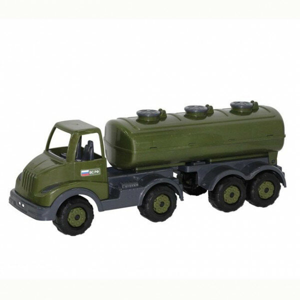 Автомобиль выполнен в военной раскраске. К переднему бамперу автомобиля можно прикрепить веревку и ребенок сможет катать игрушечный автомобиль за собой. Военный автомобиль с полуприцепом-цистерной отлично подойдет для перевозки жидкостей или сыпучих веществ. На автомобиле установлено 4 пары проходимых колес. Все люки в цистерне открываются. Восторг Вашему ребенку обеспечен Материал: высококачественная пластмасса. Окраска исключительно сертифицированными пищевыми красителями.