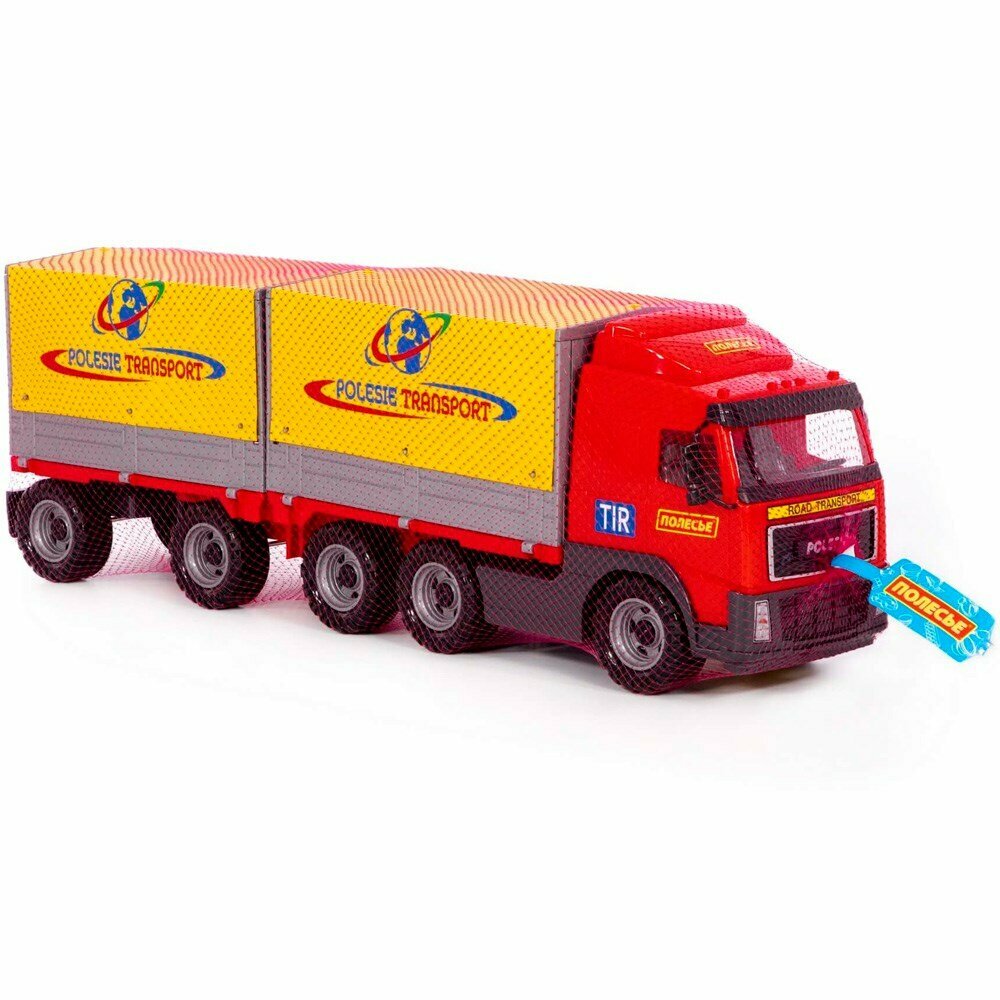 Автомобиль бортовой тентовый Volvo с прицепом (в сеточке) Полесье Бортовая машина – верный помощник в транспортировке крупногабаритных товаров. Присоедините к ней прицеп, чтобы перевезти побольше грузов! Автомобиль необычайно похож на реальный прототип шведского бренда Volvo, который можно встретить на трасах по всему миру. Это устойчивая и крепкая модель на трех парах колес, обладающая ровным ходом и маневренностью.